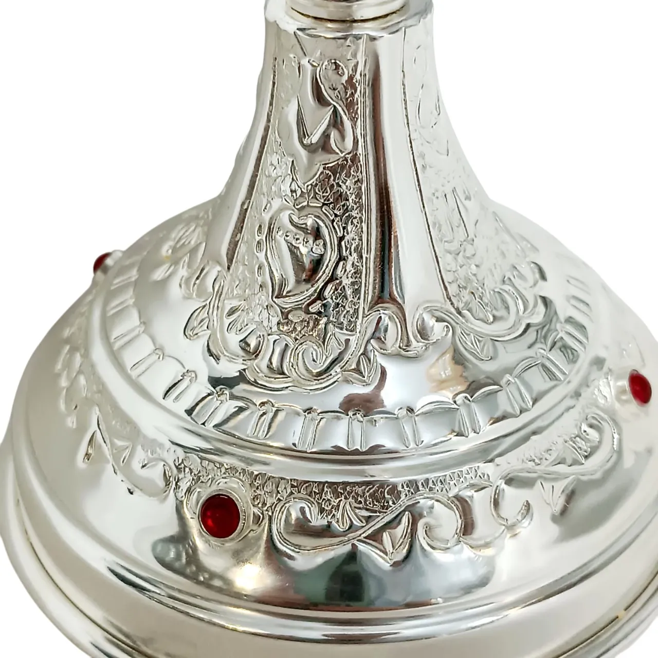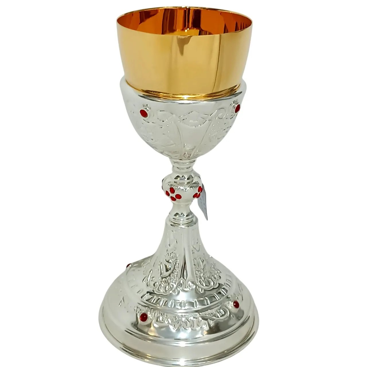 Cálice Uva é totalmente cinzelado à mão (arte de esculpir o metal). Isso confere-lhe uma singularidade: como é feito artesanalmente, nunca existirão dois iguais no mundo. Na base o artista desenhou o PX, o IHS e o Sagrado Coração. A adição de pedras vermelhas confere mais charme a esse maravilhoso vaso litúrgico.