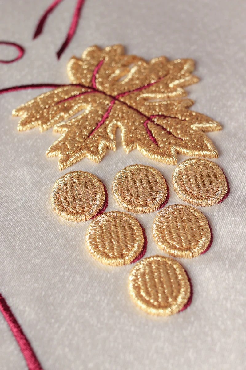 A capa é feita de tecido acetinado liso de alta qualidade. Decorado com bordados convexos em ouro e bordô. Capuz com símbolo IHS.