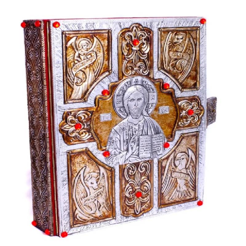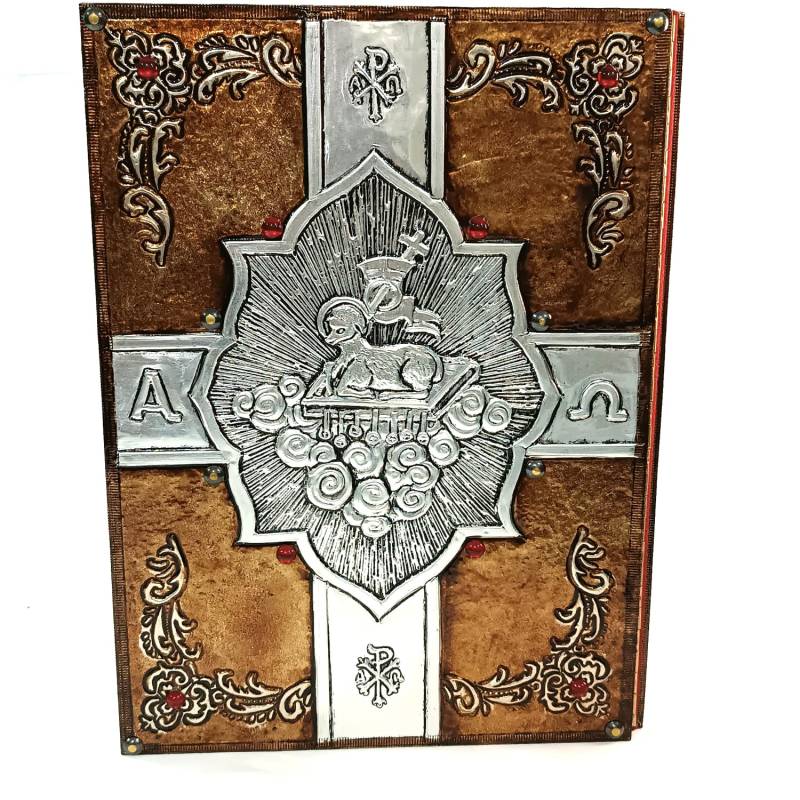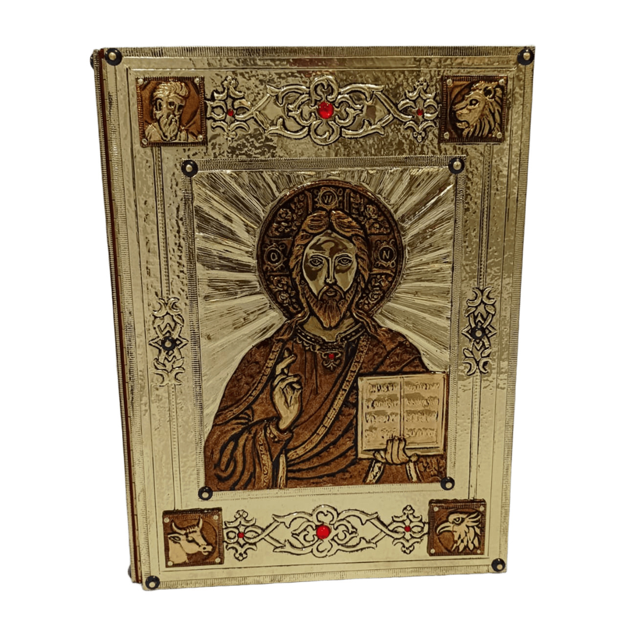 Capa para evangeliário em metal com banho dourado, pedras vermelhas e interior forrado com veludo.