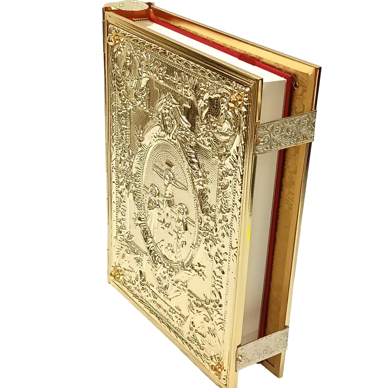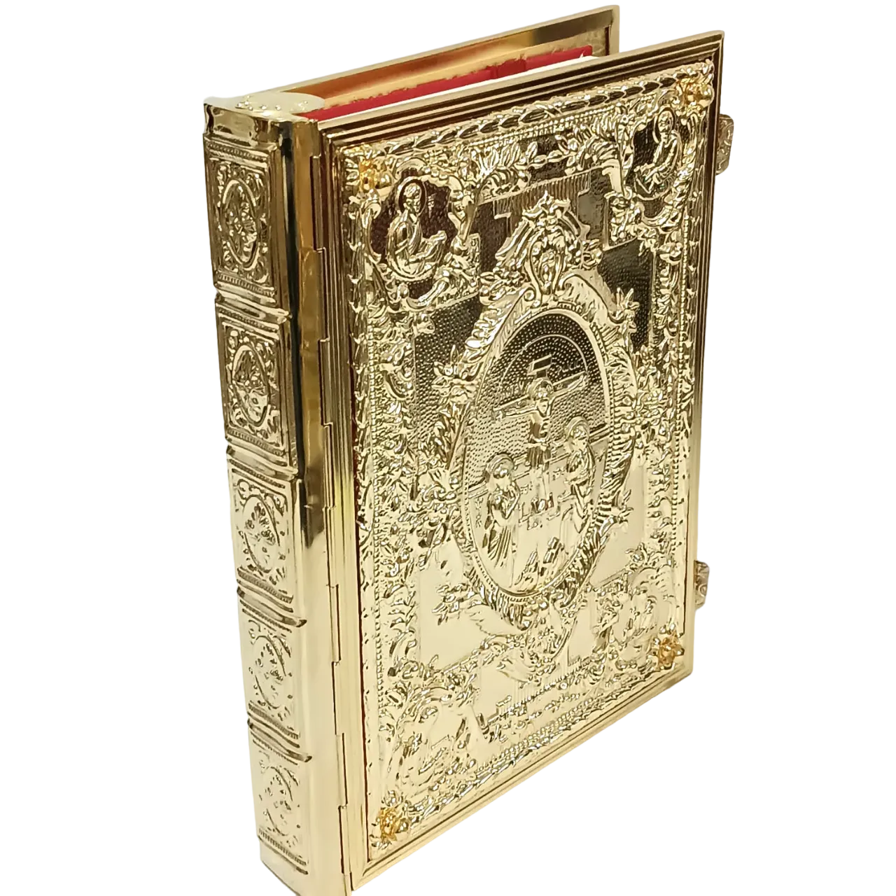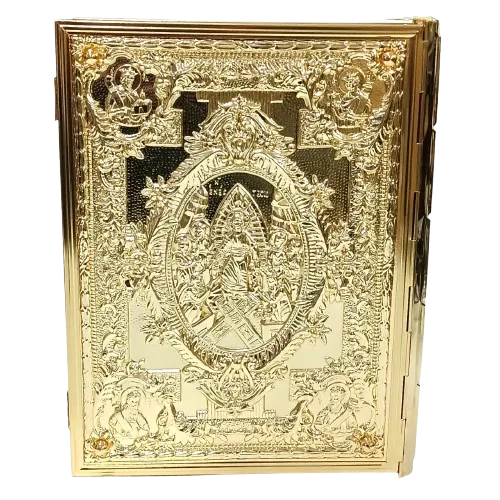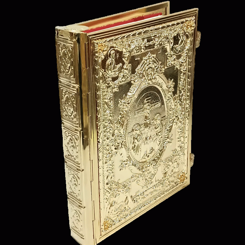 Capa de Evangeliário estilo bizantino, confeccionada com detalhes ricos e minuciosos em relevo. Produzida em metal fundido e banhada a ouro, apresenta ao centro a imagem da crucificação de Cristo, ladeada por símbolos sagrados e ícones dos Evangelistas em alto relevo. Um modelo tradicional da Igreja Ortodoxa Grega, esta capa transmite solenidade e reverência, ideal para uso litúrgico solene ou como peça de destaque em celebrações especiais. Fechamento com travas laterais e lombada também decorada.