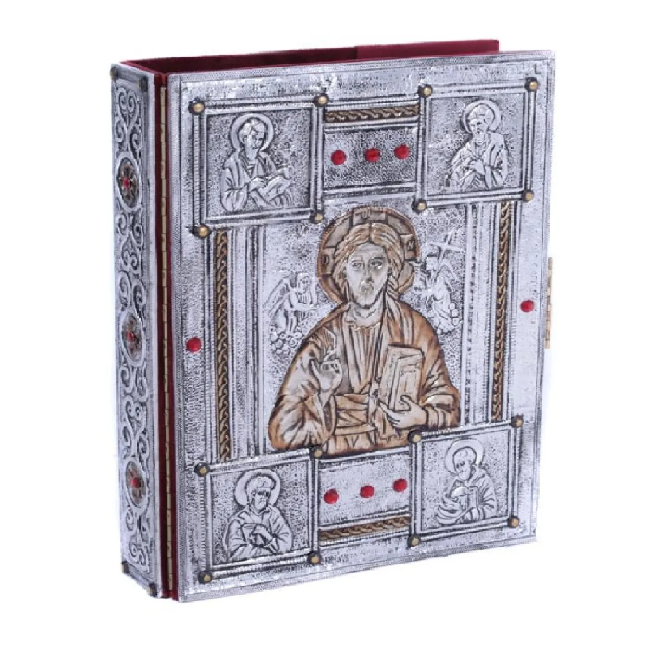 Capa para evangeliário em metal com banho em bronze, interior forrado com veludo.