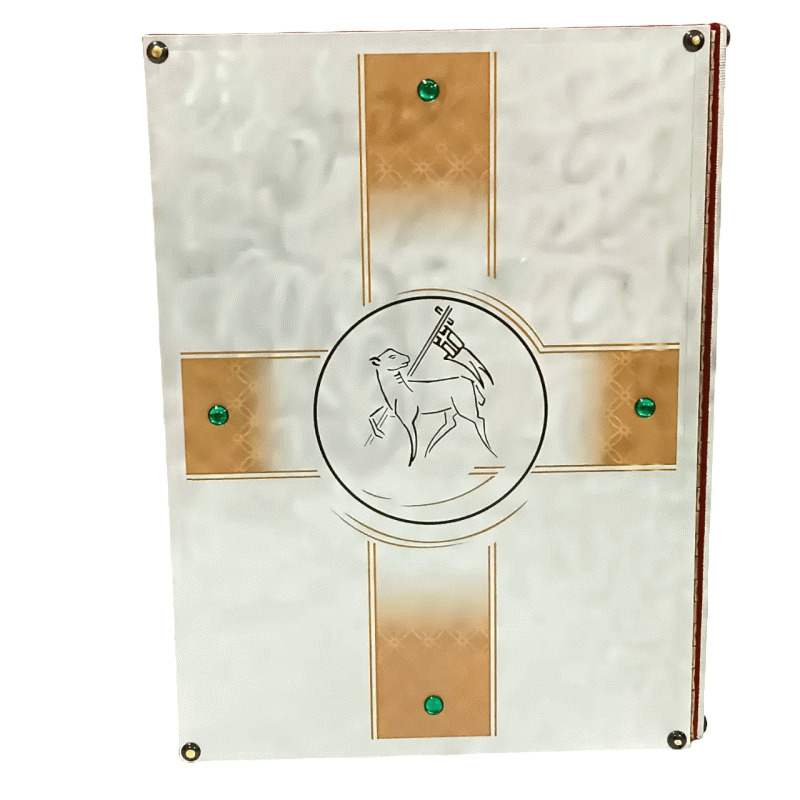 Capa para evangeliário em metal esmaltada, interior forrado com veludo.