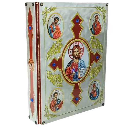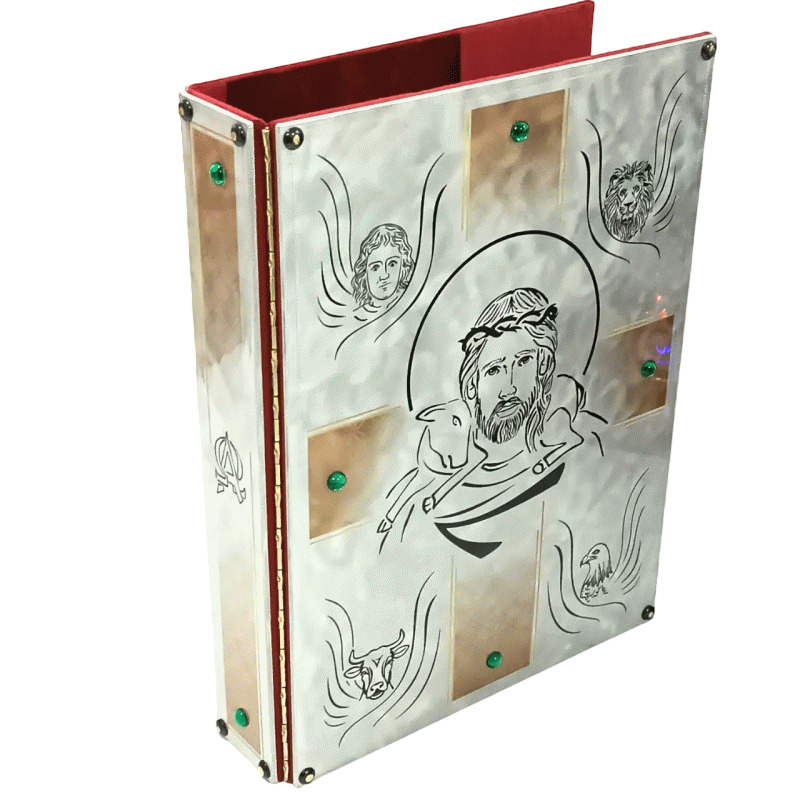Capa para evangeliário em metal esmaltada, interior forrado com veludo.