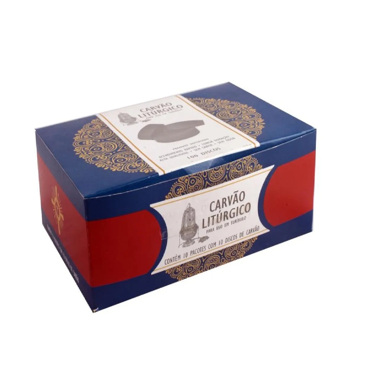 Carvão Litúrgico para turibulo é um carvão vegetal com adição de pólvora, de combustão instantânea com duração média de 30 minutos cada pastilha.