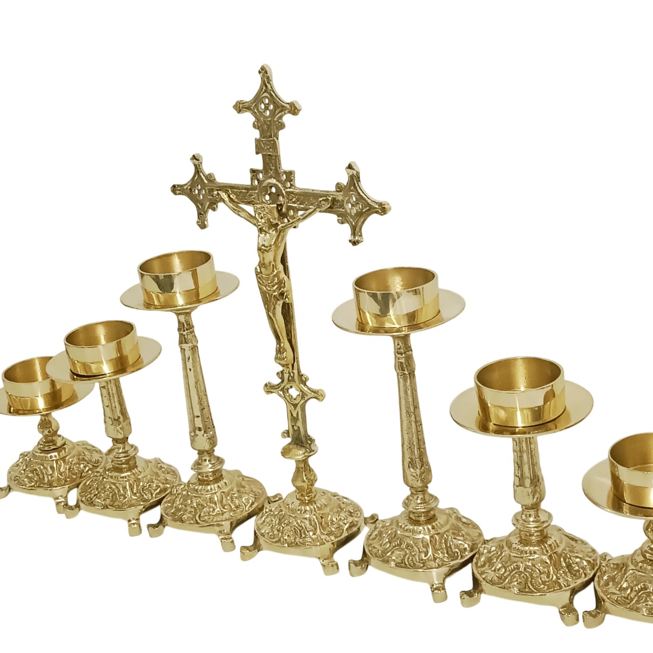 Conjunto contendo 6 castiçais – 02 pequenos, 02 médios e 02 grandes – e uma cruz: feito em bronze fundido, resistente e belo. Para vela de até 7cm (vela de altar) de diâmetro.