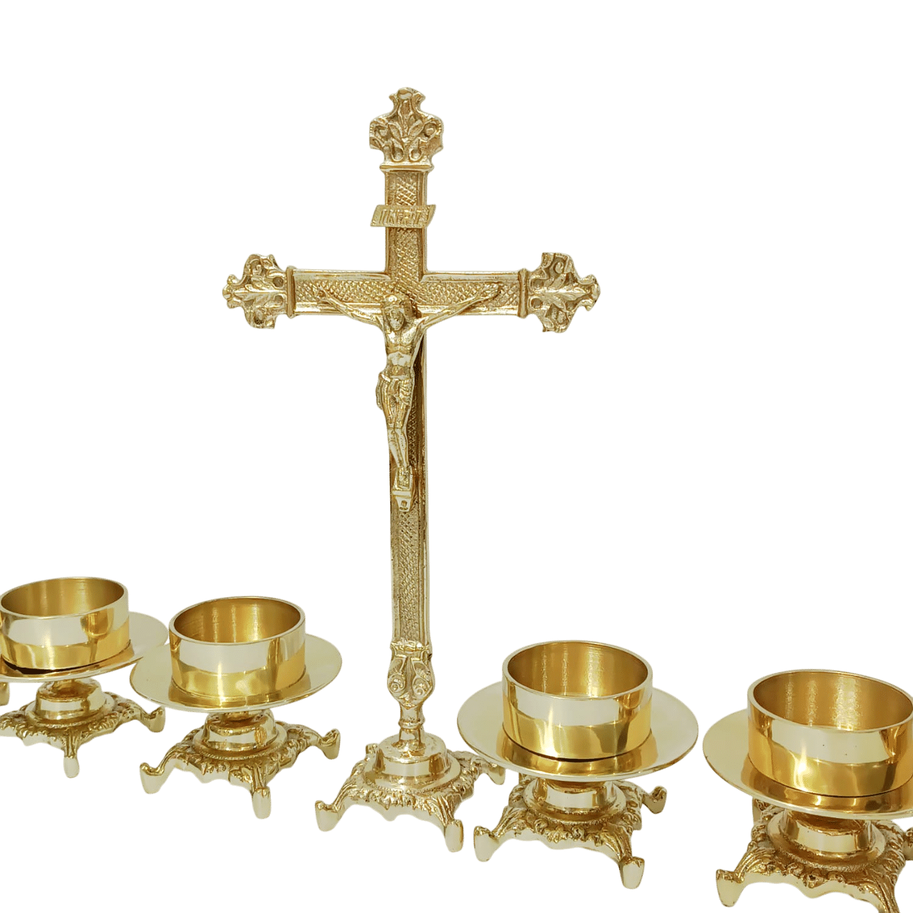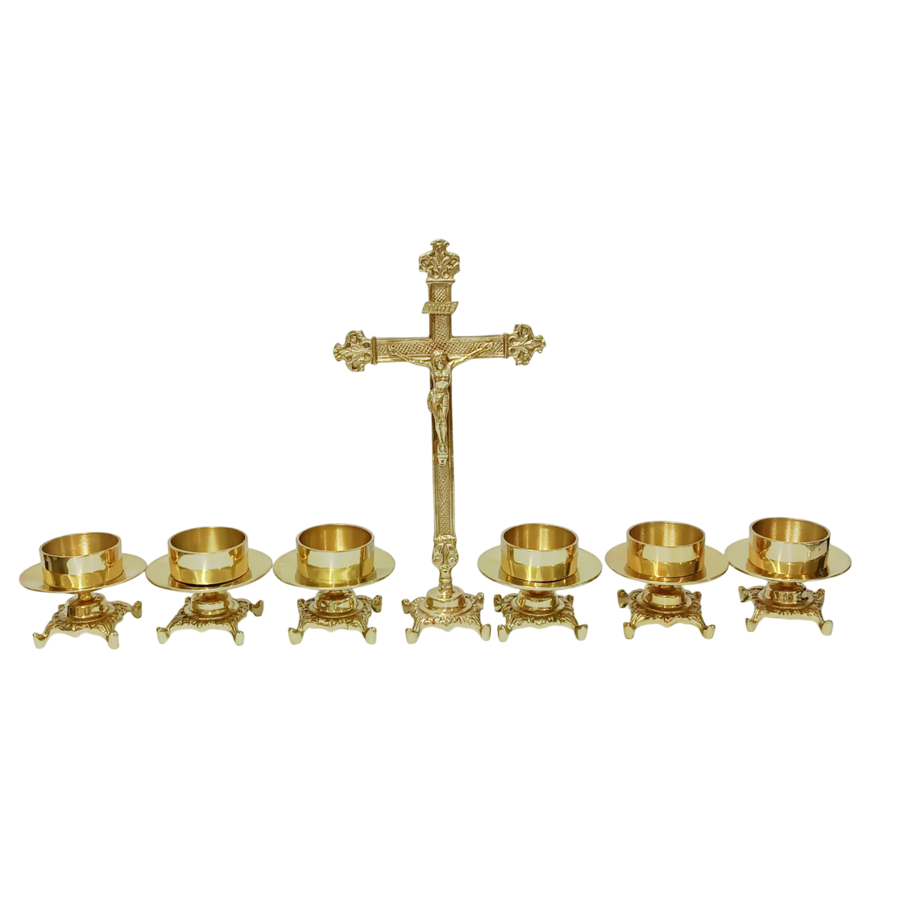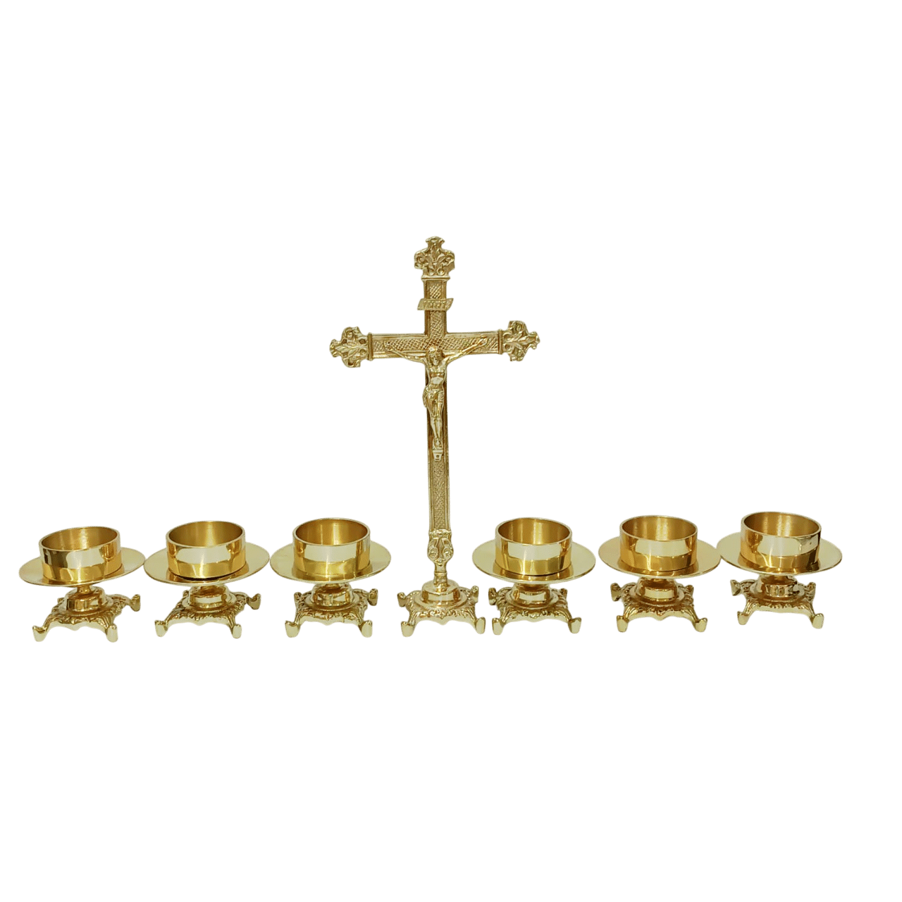Feitos em bronze fundido, garantindo durabilidade e uma aparência imponente. Com um design clássico e elegante, este conjunto é ideal para enriquecer o ambiente litúrgico. Possui 6 castiçais e 1 cruz