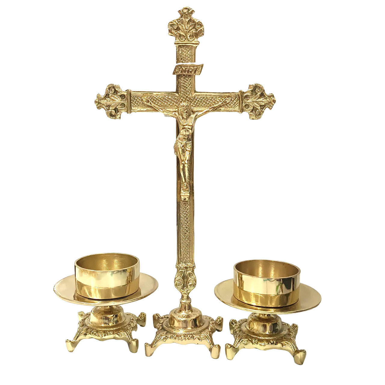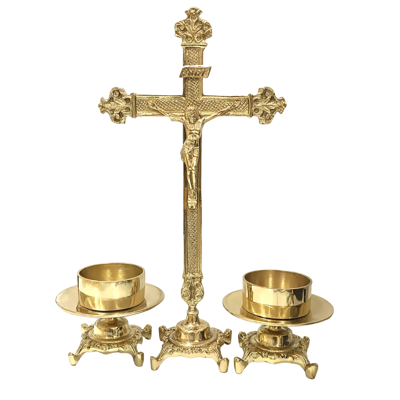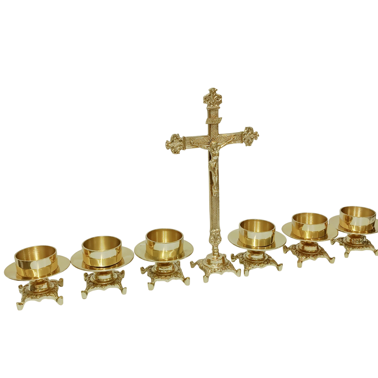 Feitos em bronze fundido, garantindo durabilidade e uma aparência imponente. Com um design clássico e elegante, este conjunto é ideal para enriquecer o ambiente litúrgico. Possui 6 castiçais e 1 cruz