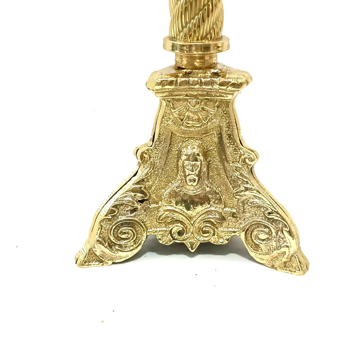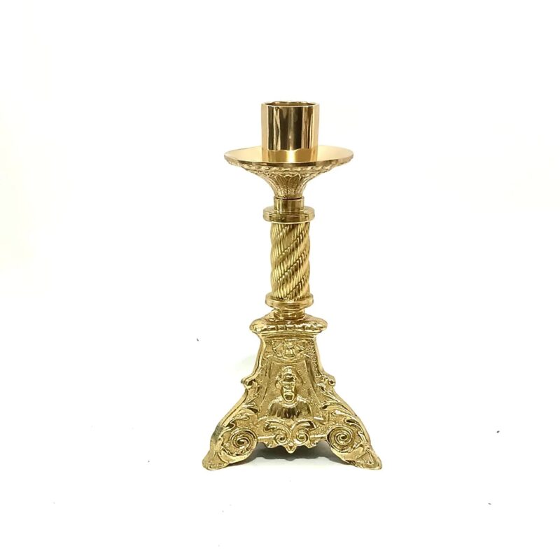 Compacto e funcional, este castiçal é ideal para velas utilizadas em missas, celebrações eucarísticas, procissões ou momentos de oração, harmonizando perfeitamente com outros objetos litúrgicos do altar.