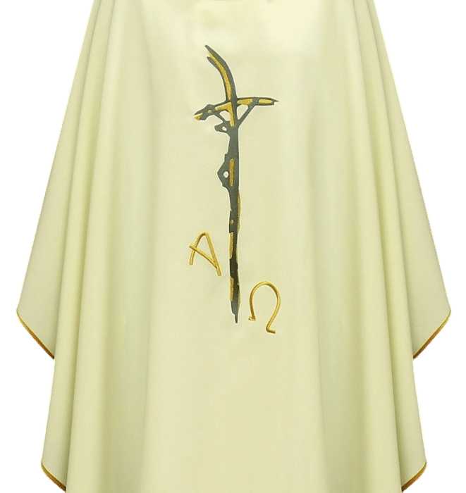 Casula sacerdotal leve, confeccionada em tecido leve, bordada com motivo de cruz e as letras AΩ. Com acabamento em cetim dourado, é a vestimenta litúrgica perfeita.