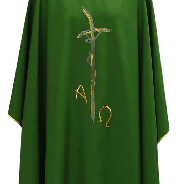 Casula sacerdotal leve, confeccionada em tecido leve, bordada com motivo de cruz e as letras AΩ. Com acabamento em cetim dourado, é a vestimenta litúrgica perfeita.