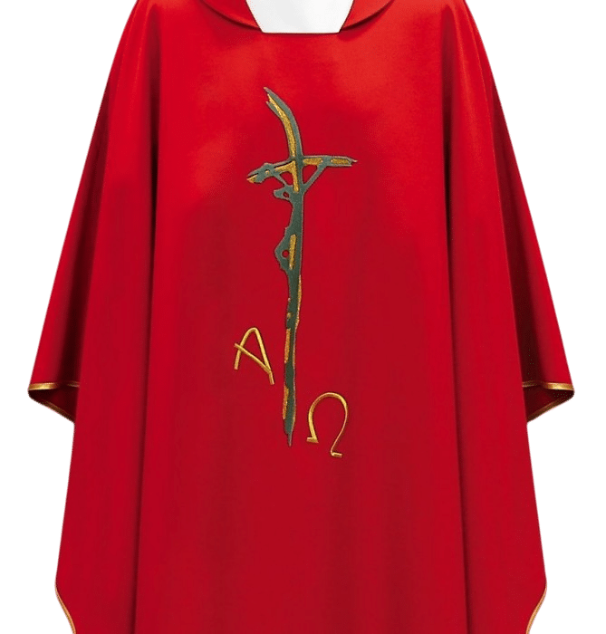 Casula sacerdotal leve, confeccionada em tecido leve, bordada com motivo de cruz e as letras AΩ. Com acabamento em cetim dourado, é a vestimenta litúrgica perfeita.