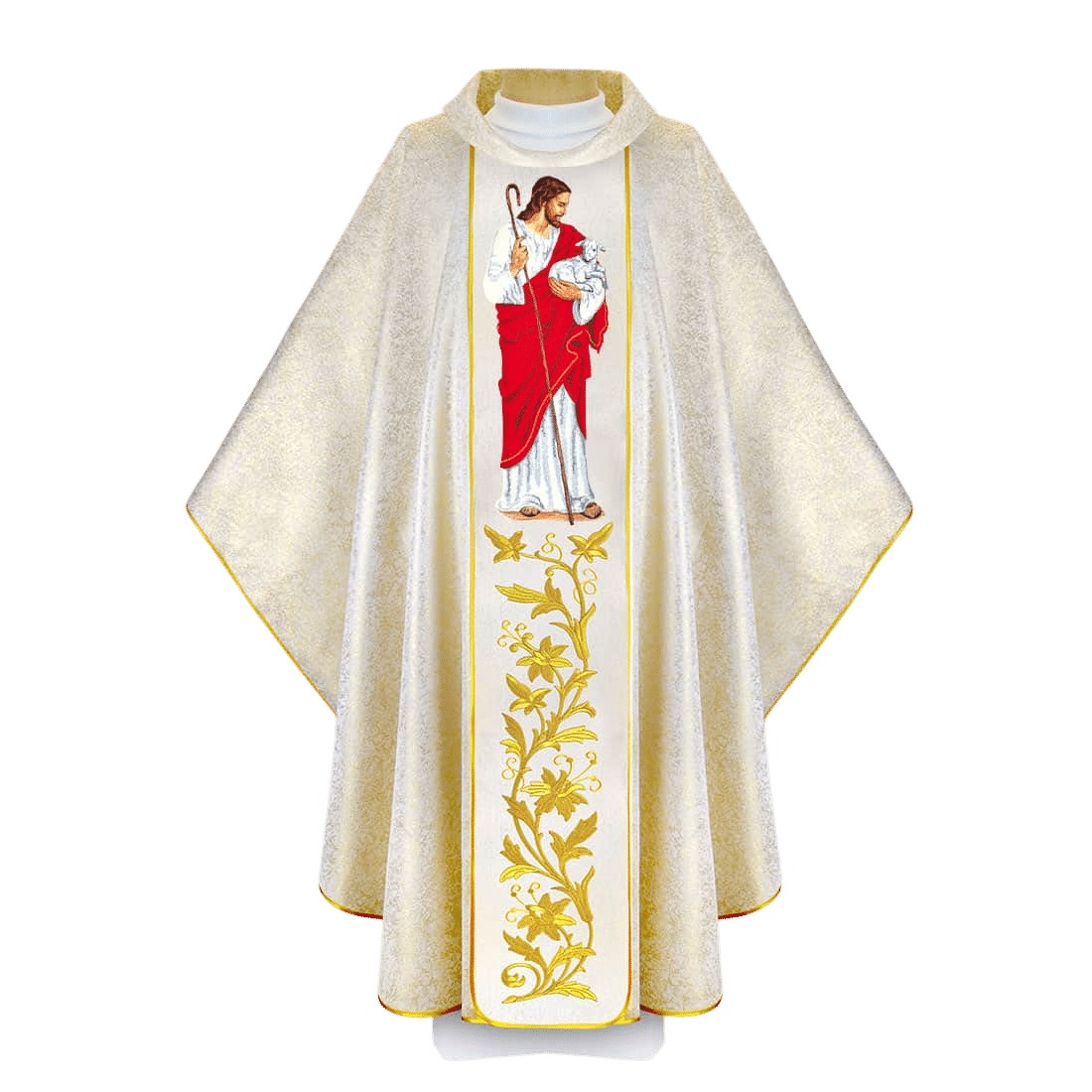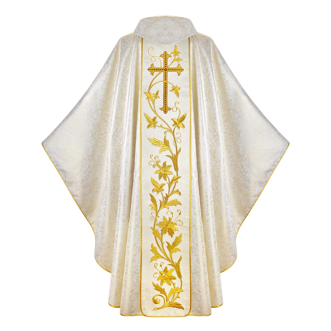 Casula feita de tecido “Papal Gold” na cor crua, com brilho sutil com fios de ouro.
