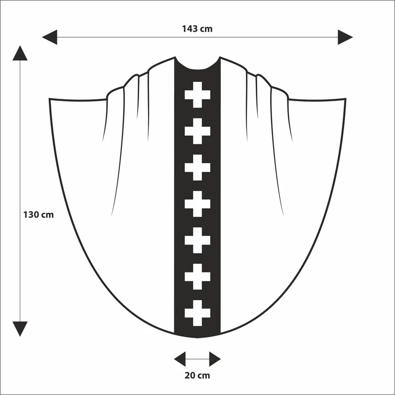 Comprimento: 1,30cm (+/-2cm) do ombro a barra da casula e largura: 1,43cm: