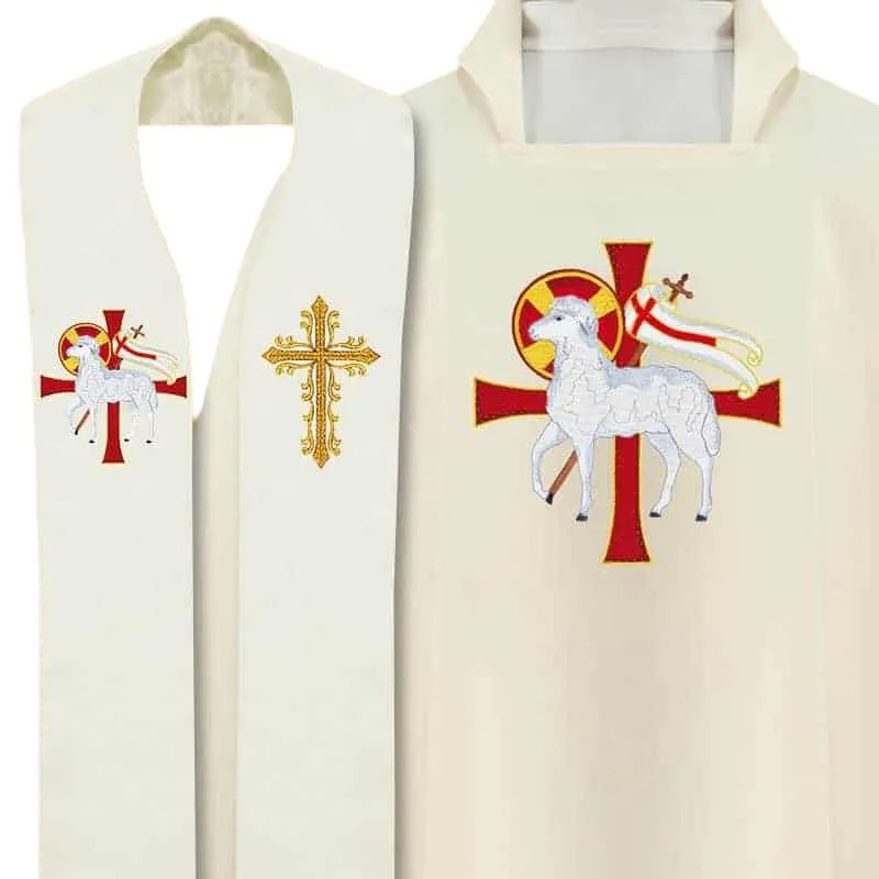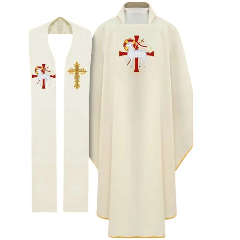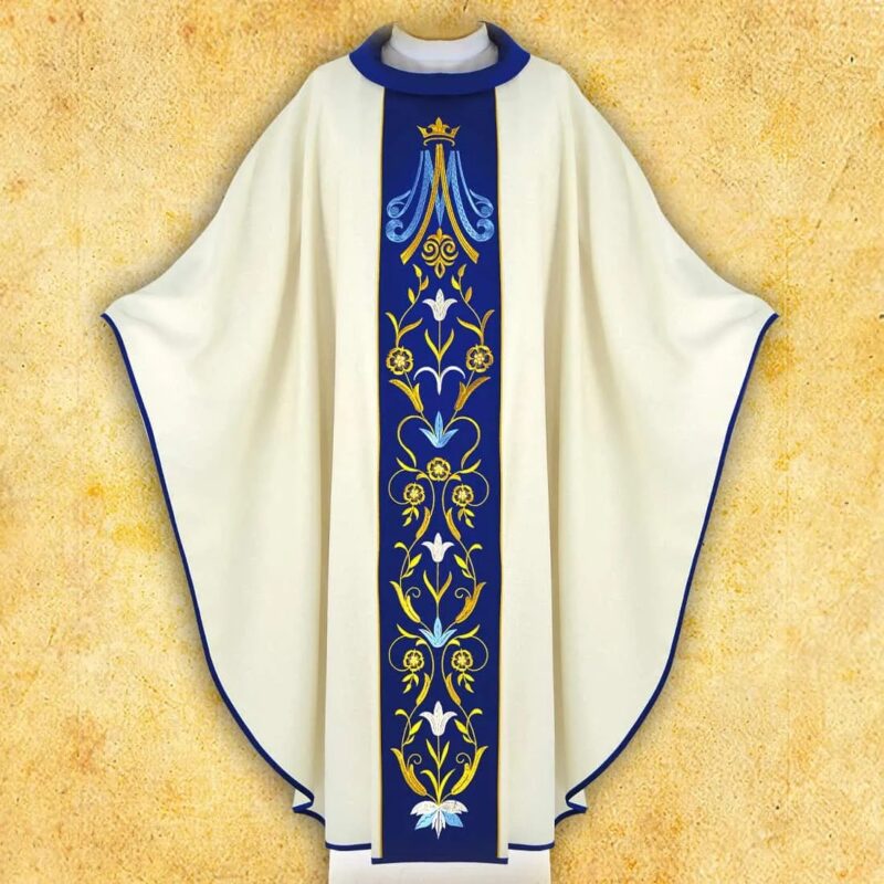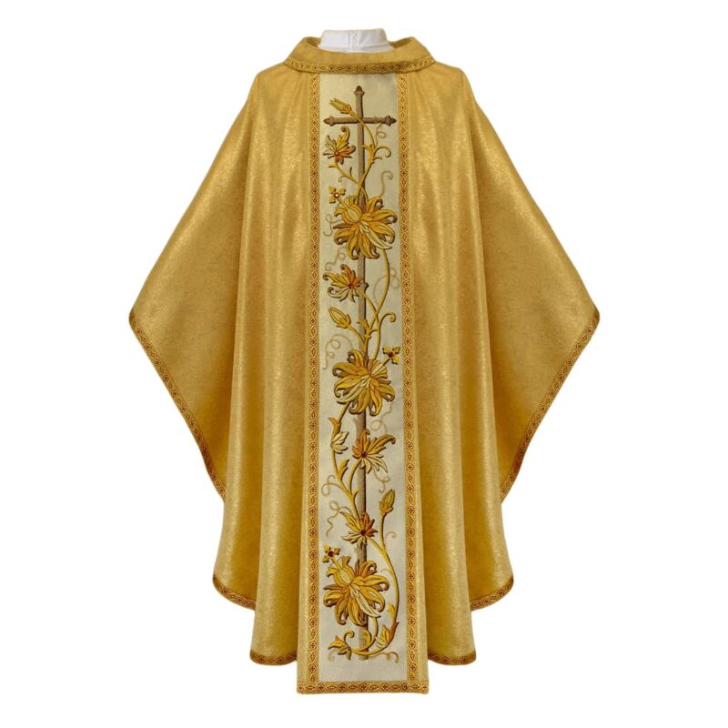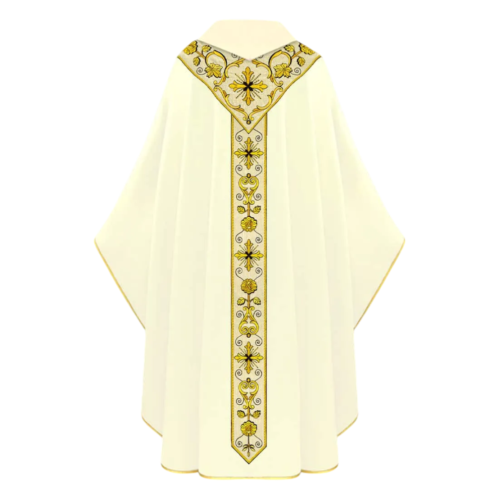 Casula com um lindo galão bordado na frente e atrás em alto relevo com fios dourados.