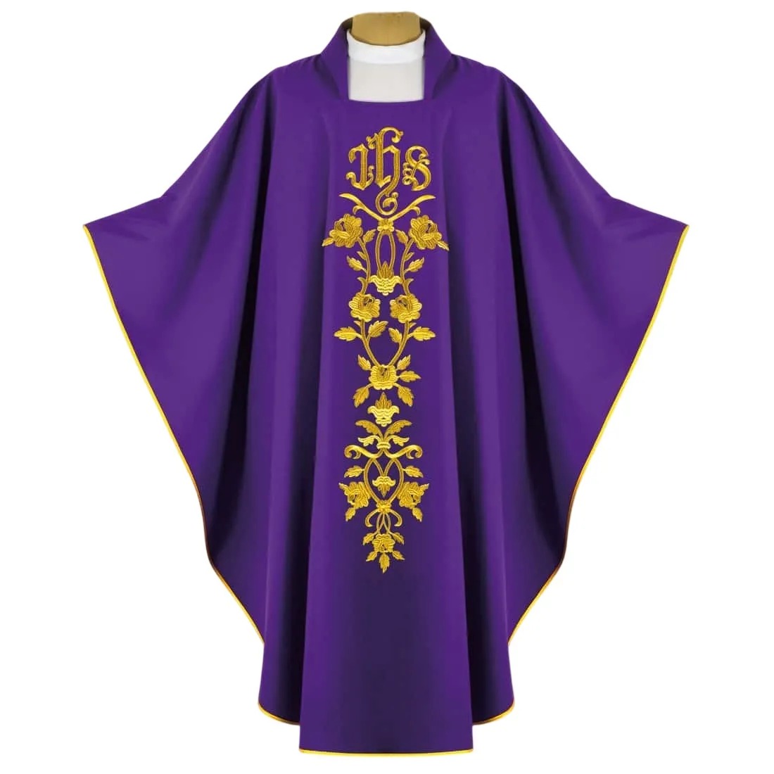 A Casula IHS Haftona – Roxa é confeccionada em tecido leve e agradável ao toque, proporcionando conforto ao celebrante. Apresenta bordado de alta qualidade em dourado, tanto na frente quanto no dorso: na frente, o monograma IHS em destaque com ramagens florais; e no dorso, um belíssimo desenho eucarístico com radiação dourada.