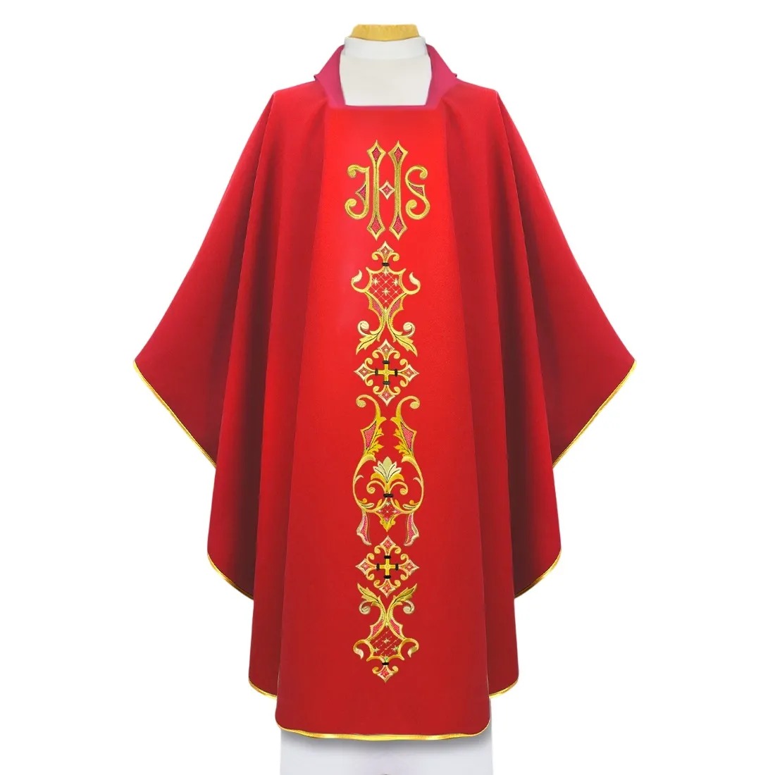 A Casula IHS – Vermelha é confeccionada em tecido leve e agradável ao toque, proporcionando conforto ao celebrante. Apresenta bordado de alta qualidade em dourado, tanto na frente quanto no dorso: na frente, o monograma IHS em destaque com ramagens florais; e no dorso, um belíssimo desenho eucarístico com radiação dourada.