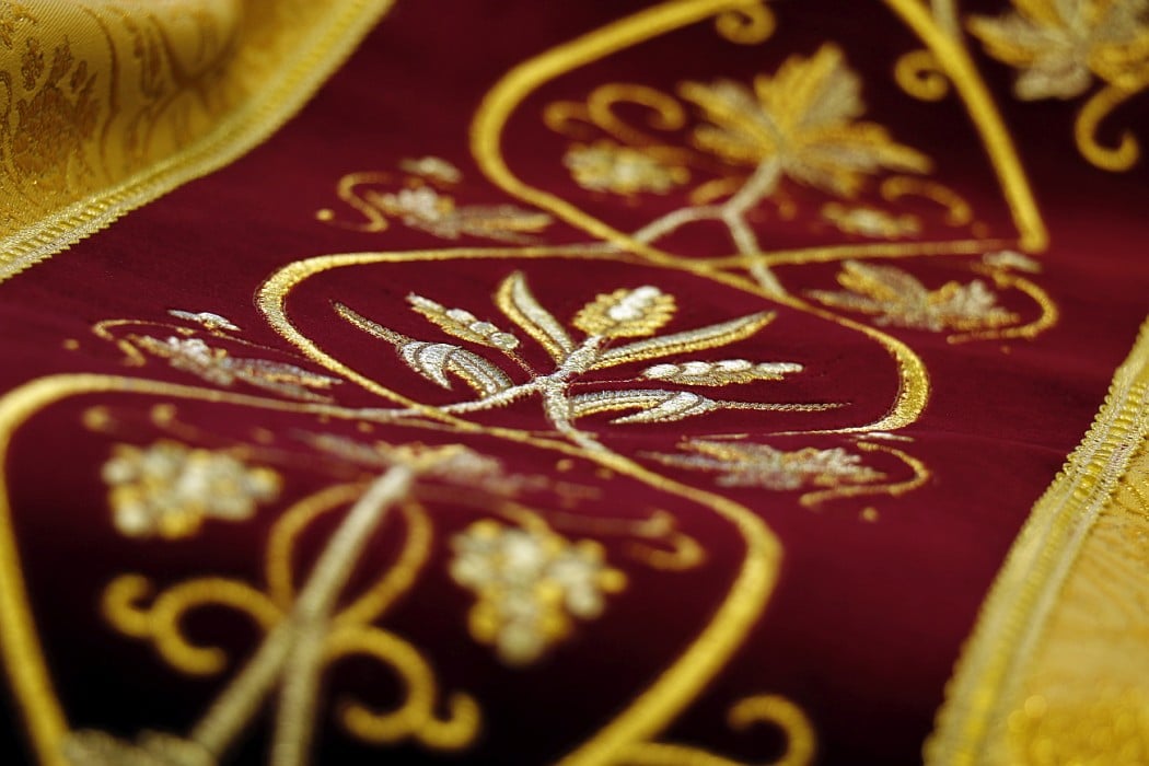 Casula decorada com bordado convexo, combinação de aplicações em cetim e bordados em tecido.