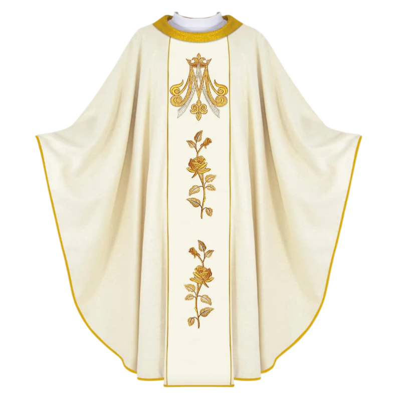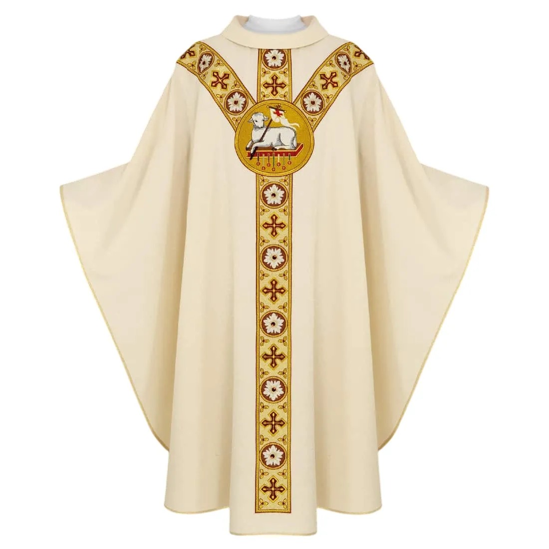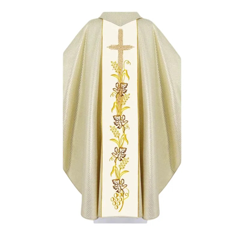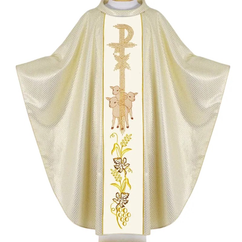 A casula semigótica é bordada em alto relevo com a imagem do Cordeiro de Deus e com pedras de altíssima qualidade.