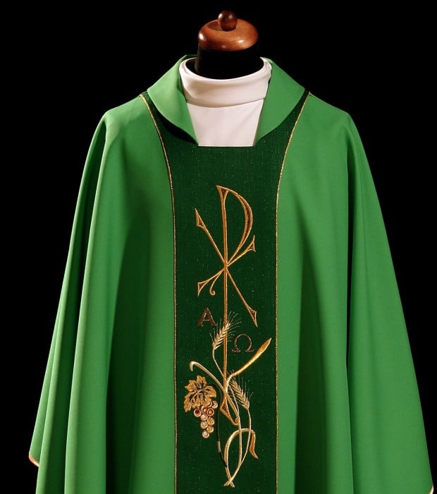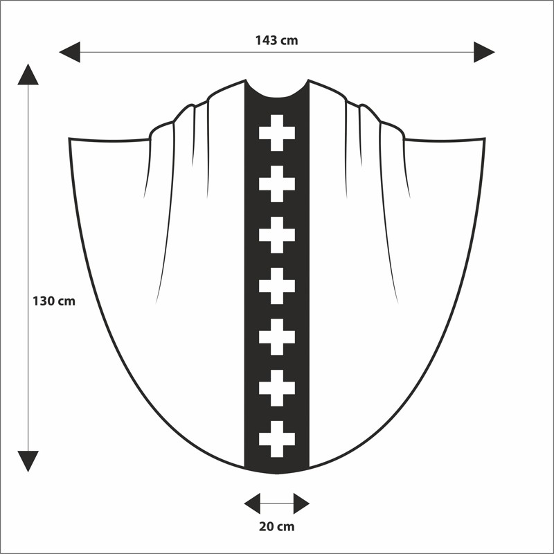 Casula decorada com bordado convexo, combinação de aplicações em cetim e bordados em tecido.