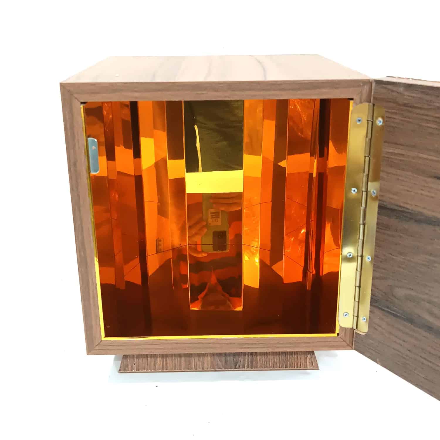 Sacrário produzido em madeira, com revestimento de metal. Interior também com revestimento de metal.