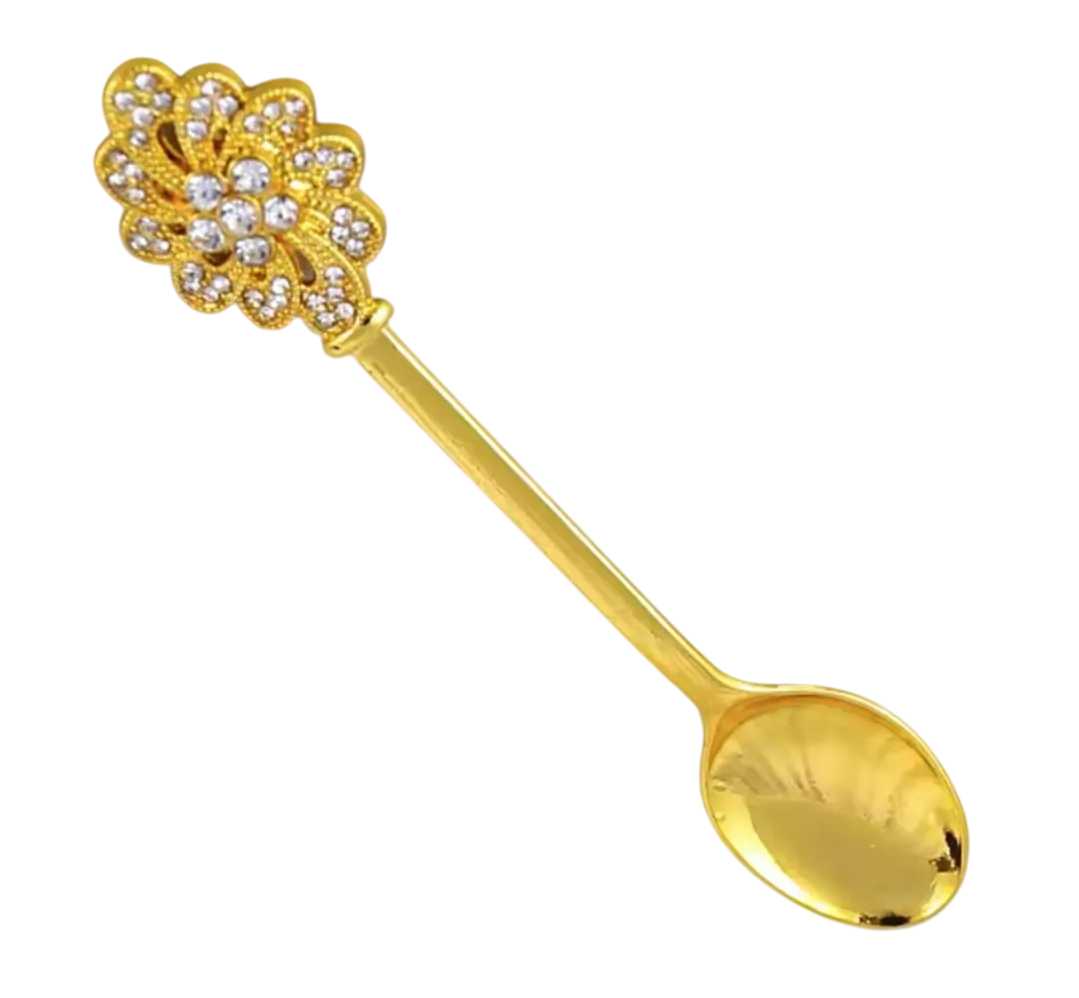 Colher litúrgica confeccionada em metal com acabamento banhado a ouro, ideal para uso com o turíbulo durante celebrações religiosas. Possui design detalhado no cabo, com aplicação de pedras brilhantes que conferem requinte e sofisticação à peça.