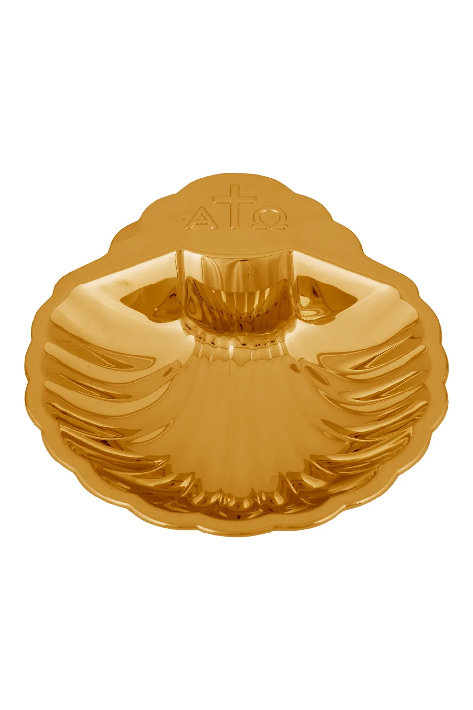 Concha Batismo Dourada 922. Concha para batismo fabricada em latão com banho dourado e gravação em alto relevo. Possue uma anel para facilitar