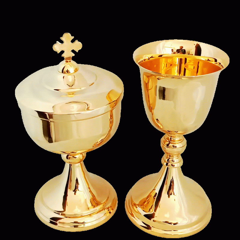 Âmbula e cálice litúrgico italianos confeccionado em metal de alta qualidade, com acabamento polido e banho de ouro 24k, garantindo durabilidade, brilho intenso e fácil higienização. Possui tampa com cruz, ideal para o armazenamento reverente do Corpo de Cristo e seu preciosíssimo sangue.
