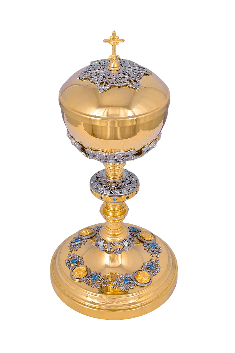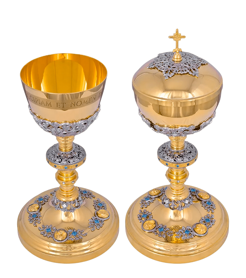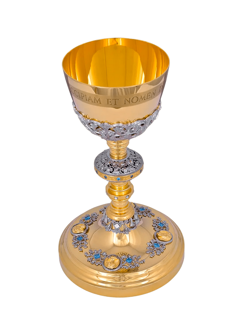 Cálice 816/3 Pedras Azuis Produzido em liga metálica com banho dourado e detalhes niquelados fundidos em cera perdida. Detalhe: pedras sintéticas azuis e apliques dos quatro evangelistas aplicados à peça. Frase gravada na copa: calicem salutaris accipiam et nomen domini invocabo.