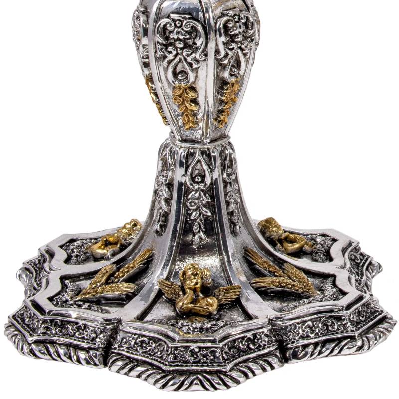 Cálice e cibório em estilo barroco, com elegante motivo “Anjos e Espigas de Trigo” em acabamento em prata envelhecida com detalhes prateados.