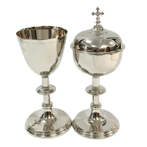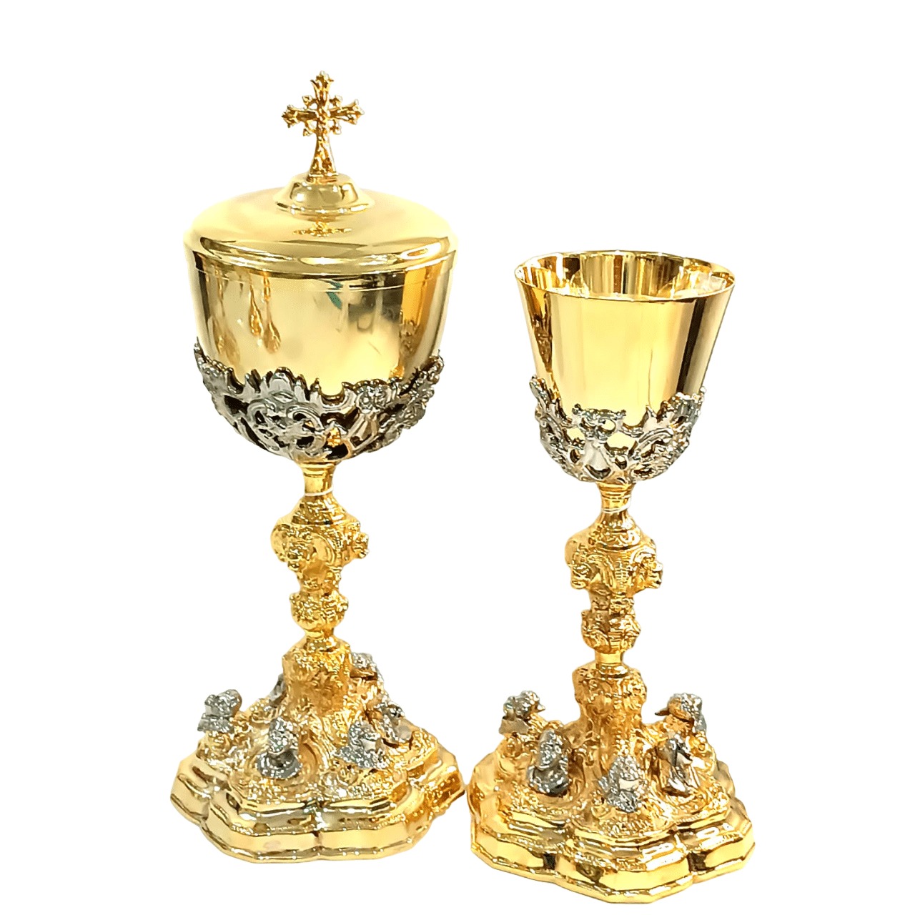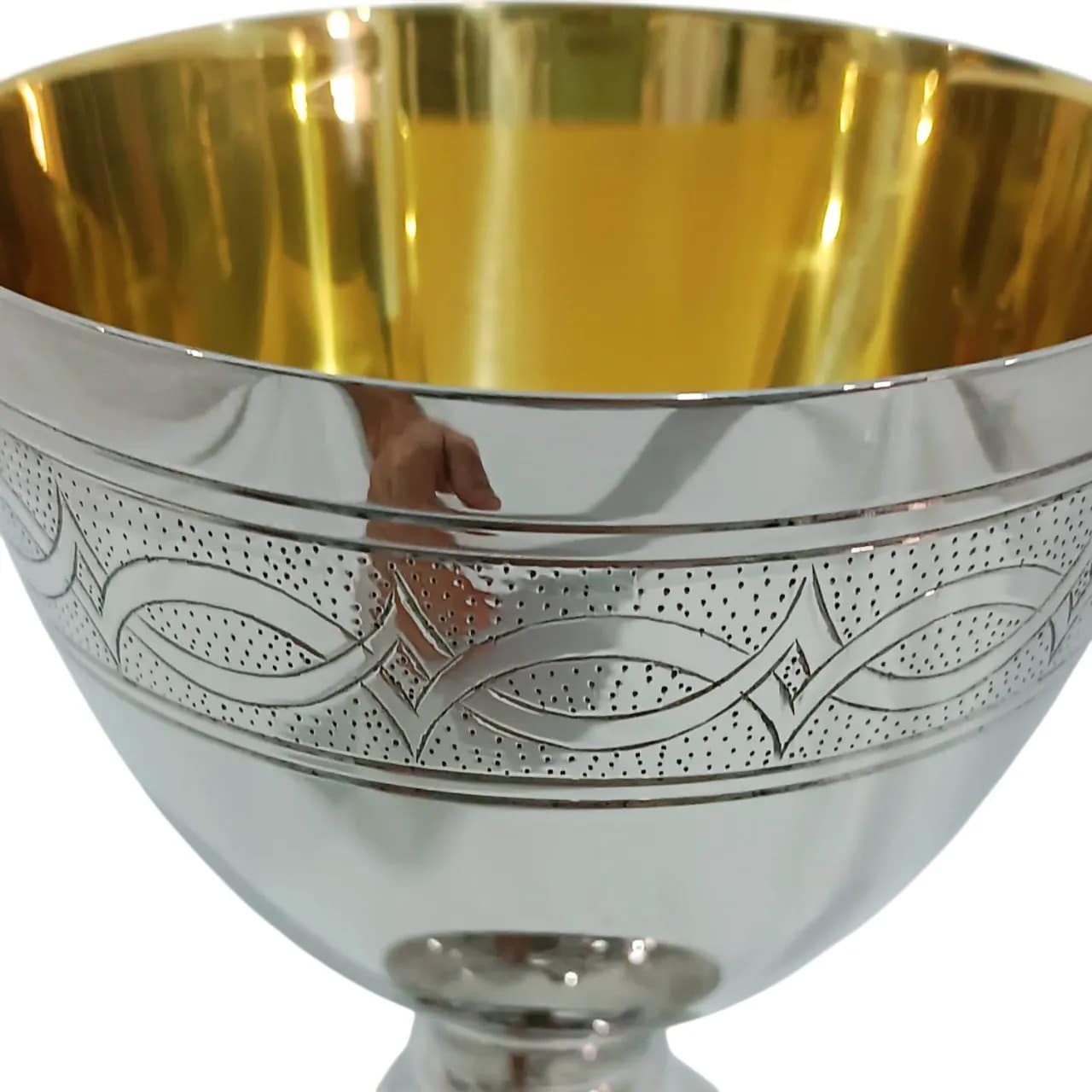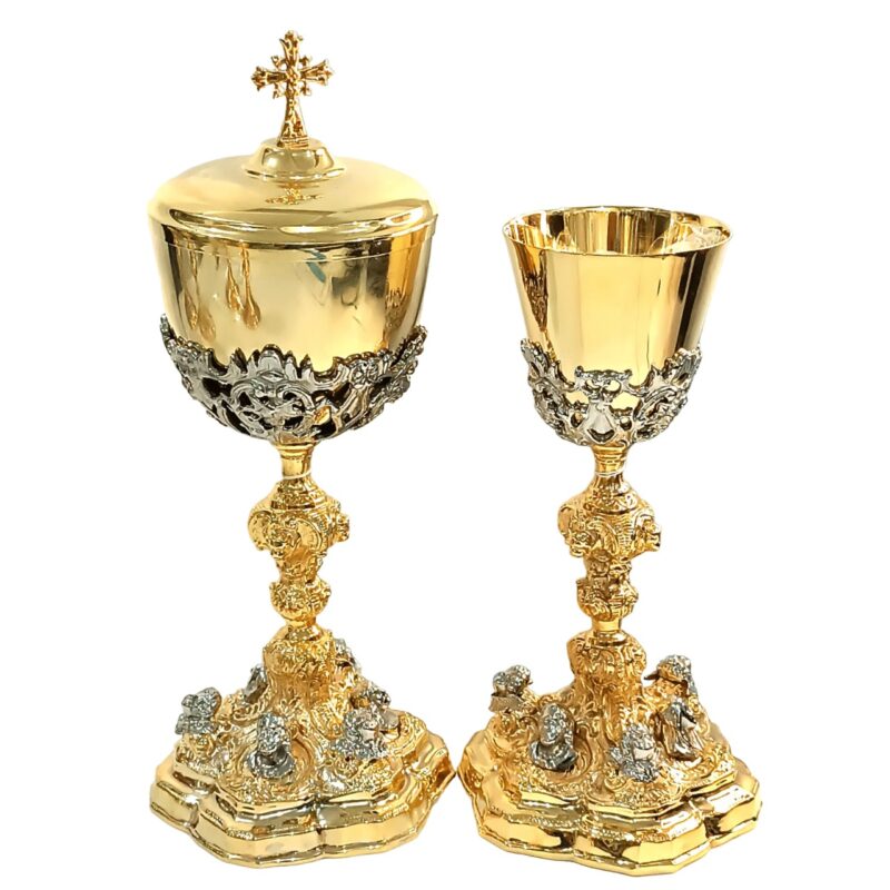 Conjunto italiano composto por cálice e âmbula “Coroa de Espinhos”, produzidos em latão fundido com banho de níquel e interior dourado. As peças apresentam rico entalhe decorativo com motivo de coroa de espinhos e cruzes em relevo na base, unindo beleza, simbologia e resistência.