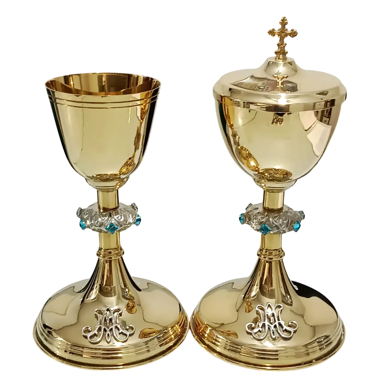 O Conjunto de Âmbula e Cálice Mariano é uma opção de vasos sagrados singelos e dignos. Ele carrega em sua base o símbolo Mariana. Em sua coluna pedras azuis (cor mariana).