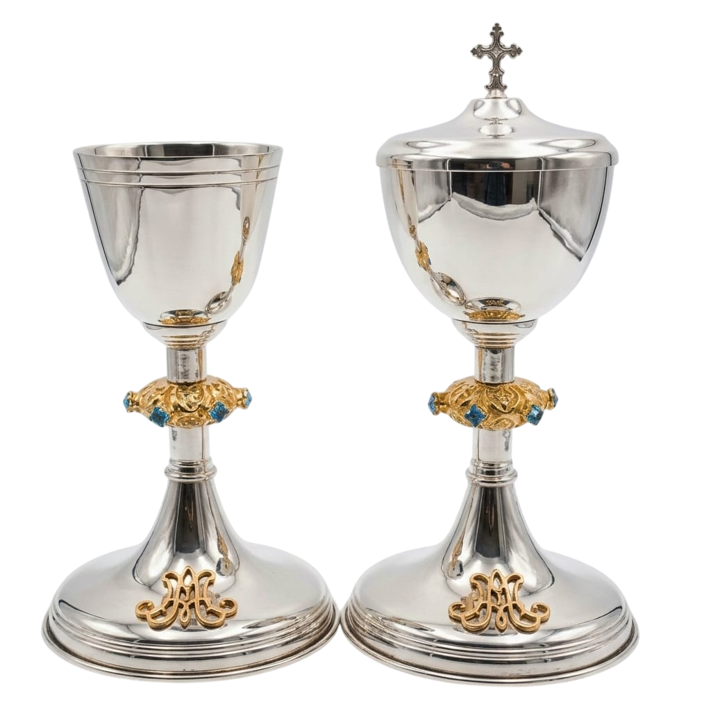 O Conjunto de Âmbula e Cálice Mariano é uma opção de vasos sagrados singelos e dignos. Ele carrega em sua base o símbolo Mariana. Em sua coluna pedras azuis (cor mariana).