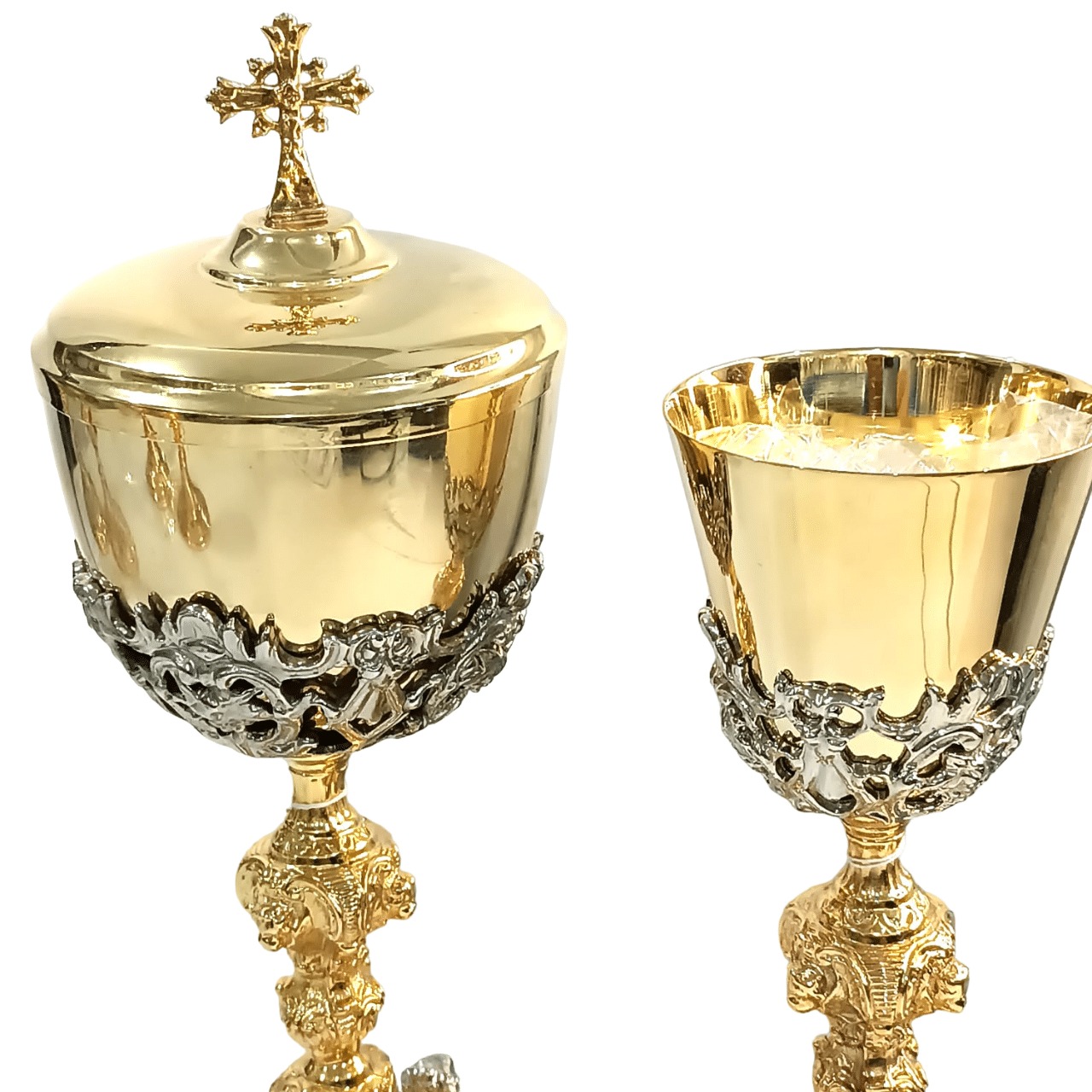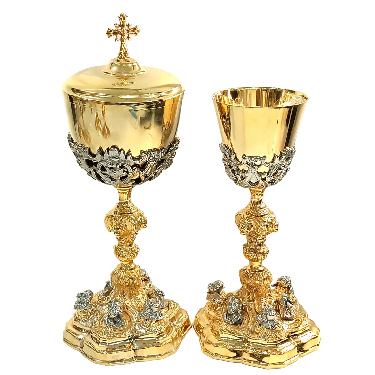 Cálice e Âmbula para distribuição – feitos no Brasil, em metal. Na base deste Cálice e Âmbula, estão os bustos de Jesus, Maria e José e anjos. Todos prateados. Peça barroca.
