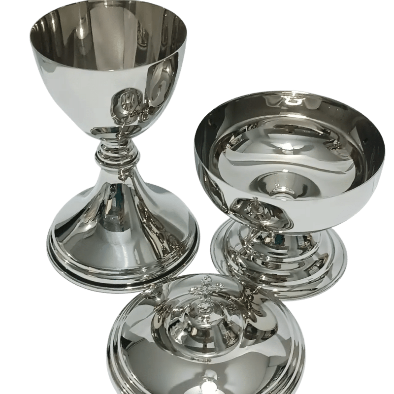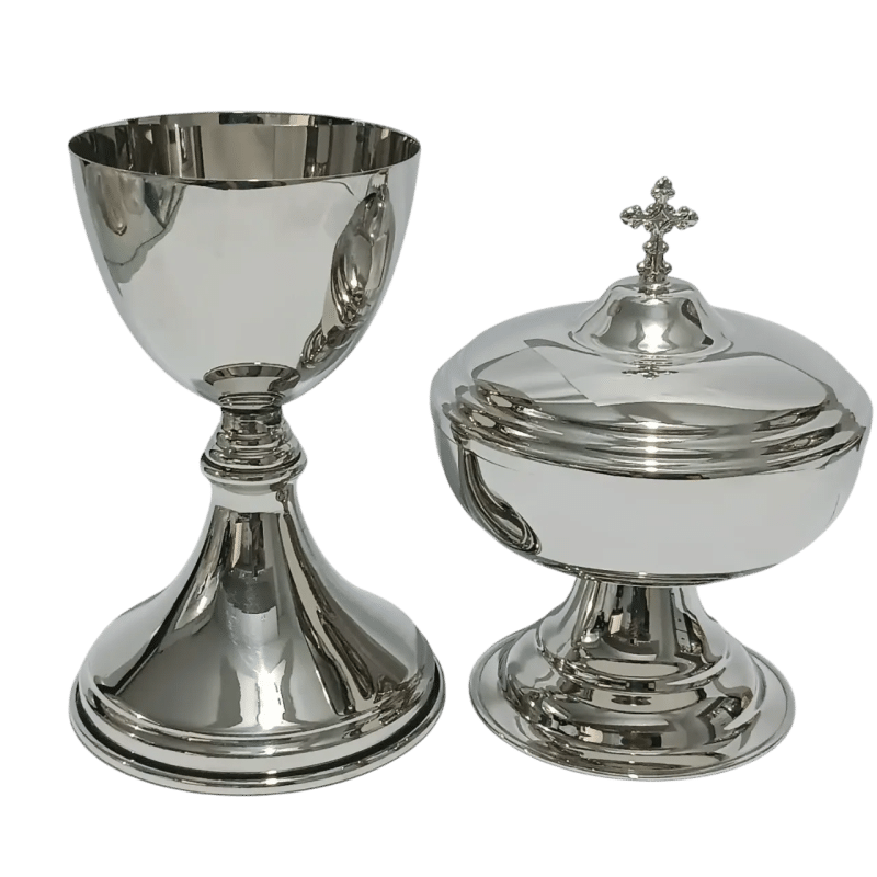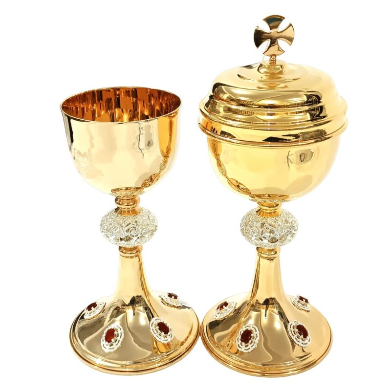 Conjunto litúrgico italiano composto por cálice e âmbula “Sanguis Meus”, confeccionados em metal fundido com banho de prata envelhecida e interior dourado.