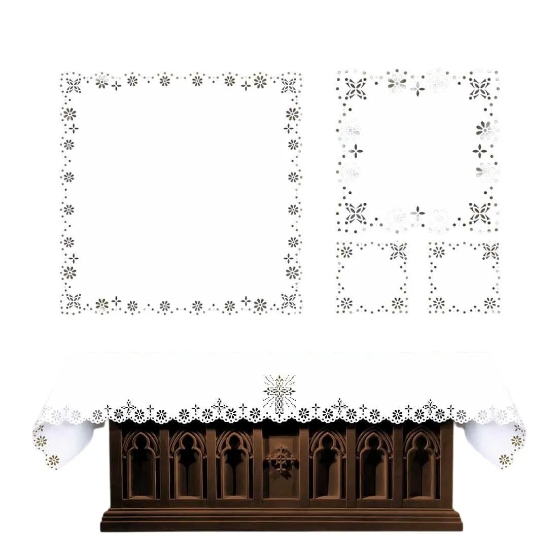 Conjunto de altar vazado a laser, feito em tecido se altíssima qualidade, resistente a manchas.