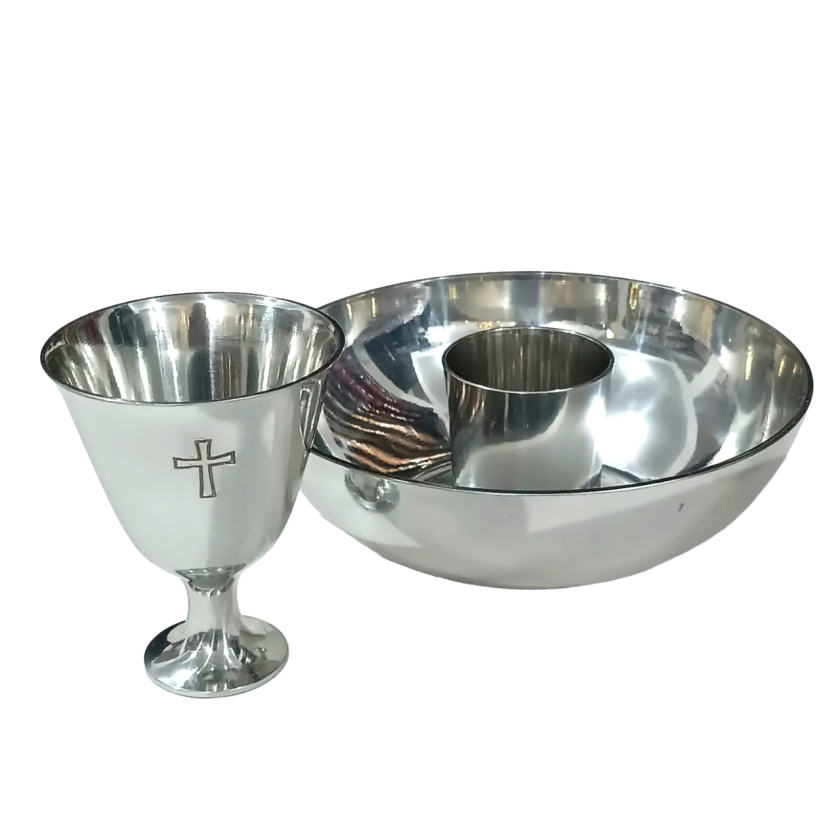 Para hóstia e vinho, em estanho polido, com verniz especial incolor.