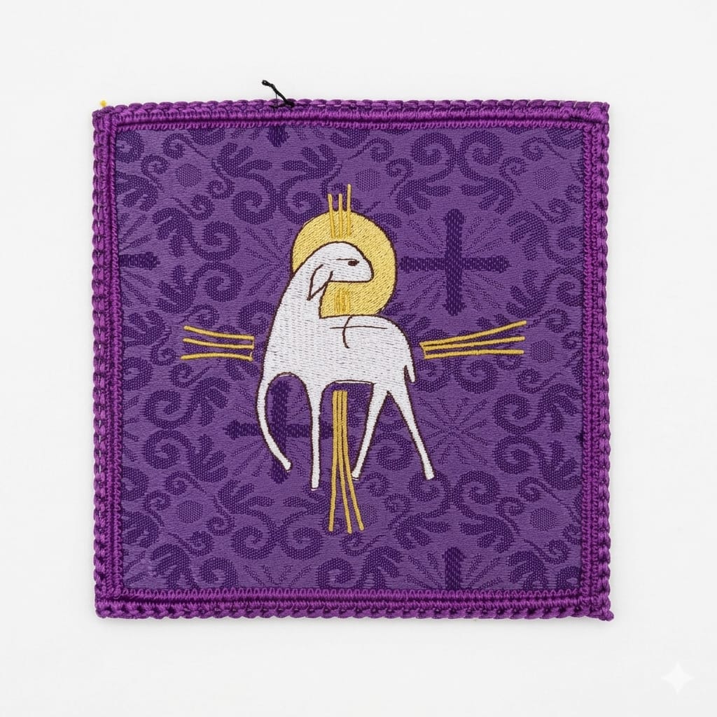 O bordado central apresenta o Cordeiro em destaque, envolto por elementos ornamentais que reforçam a sacralidade da peça. O fundo ricamente trabalhado com desenhos delicados e cruzes cria uma composição harmoniosa, enquanto os detalhes em acabamento conferem nobreza e elegância ao conjunto.