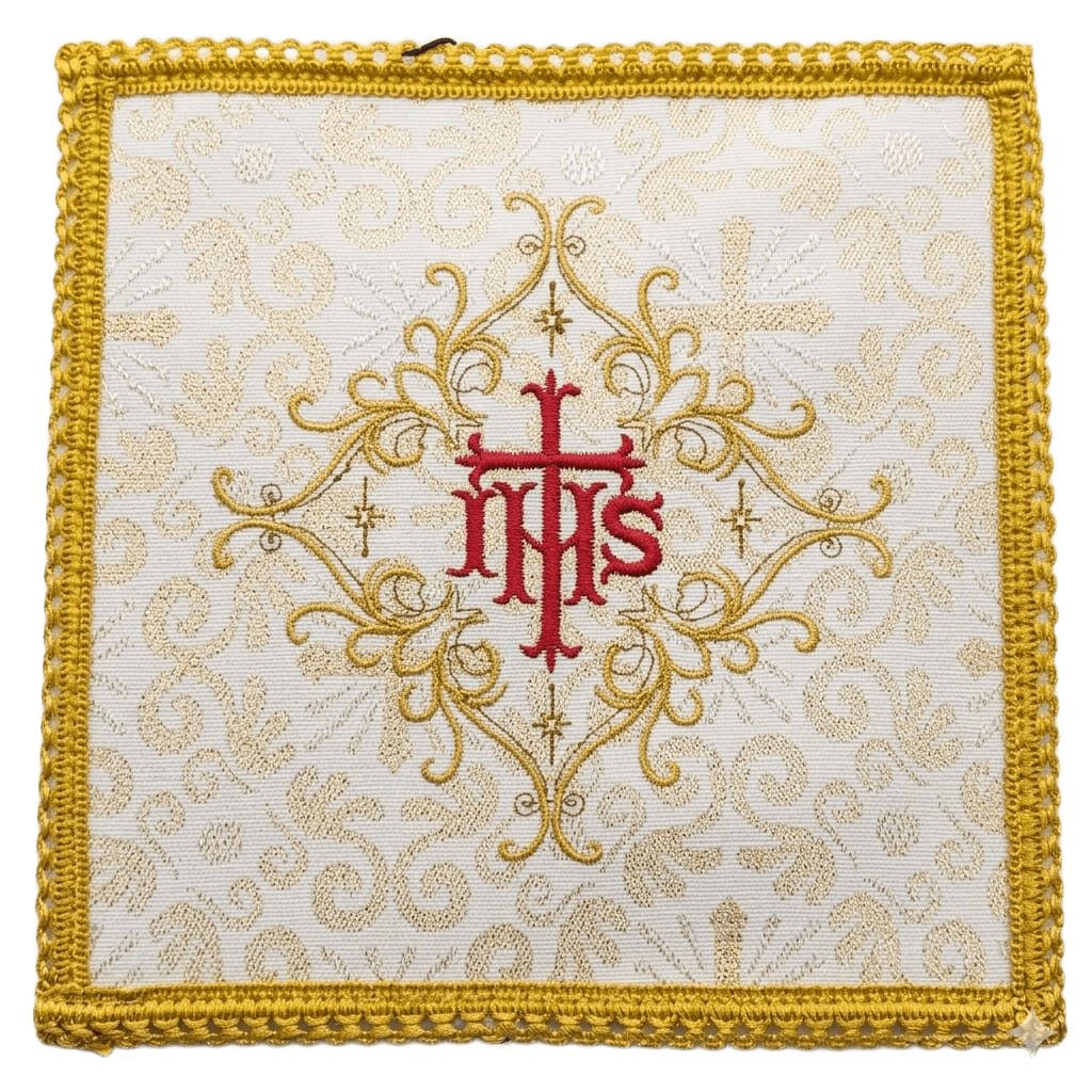 O Conjunto de Alfaias IHS Majestade Dourada é uma peça de grande riqueza simbólica e estética, ideal para elevar a dignidade das celebrações litúrgicas. Seu destaque está no belíssimo bordado central com o monograma “IHS”, símbolo do Santíssimo Nome de Jesus, acompanhado por uma cruz em evidência e arabescos ornamentais em fios dourados que remetem à tradição e à nobreza da Igreja.