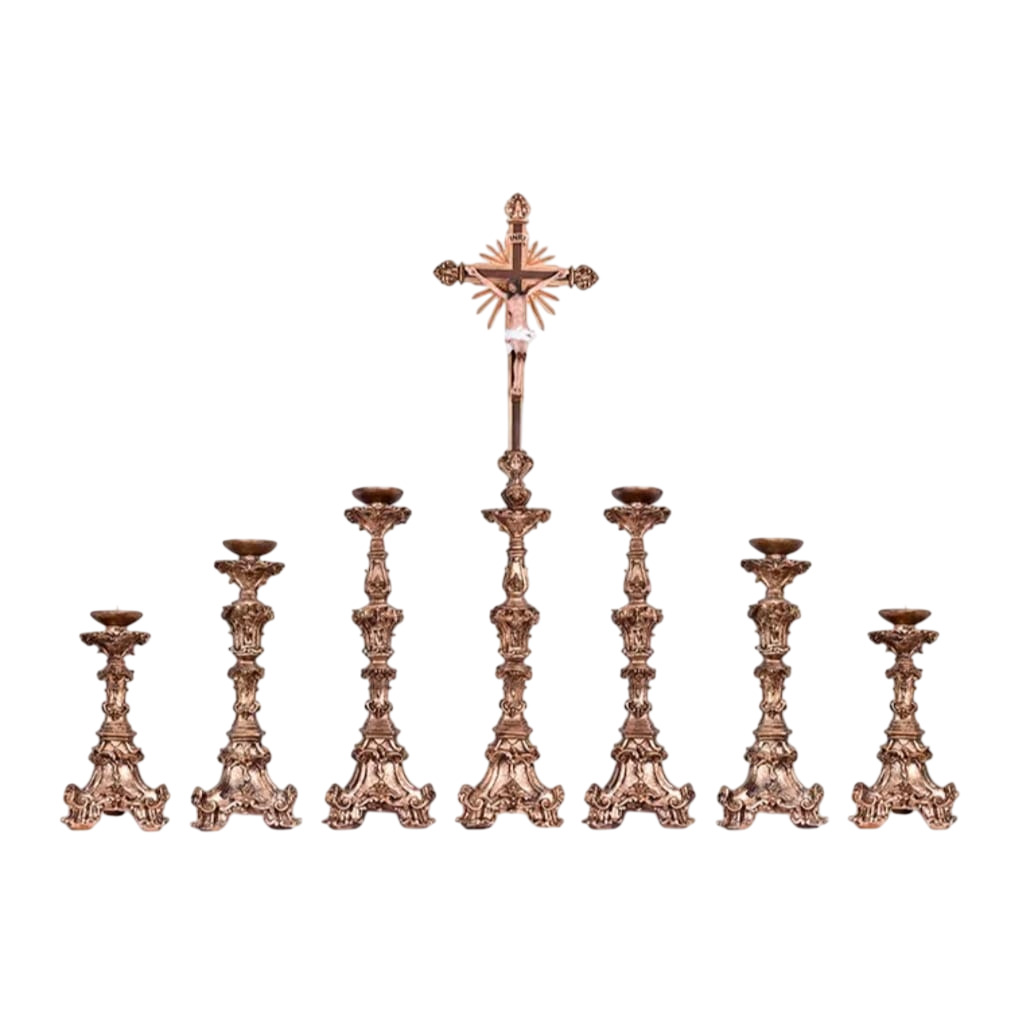O conjunto é composto por 7 peças, organizadas de forma harmônica para uso no altar, proporcionando um visual solene e equilibrado durante as celebrações.