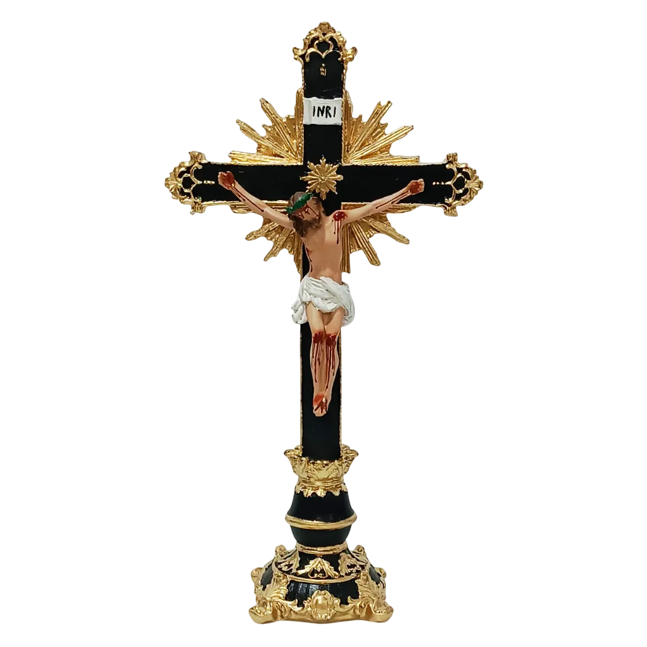 Esta belíssima cruz de mesa é produzida em resina e pintada à mão, com acabamento em estilo barroco que valoriza cada detalhe da peça. Com base ornamentada em preto e dourado, ela traz a imagem do Cristo crucificado em destaque, acompanhada de um resplendor dourado ao fundo, proporcionando imponência e profundidade visual.