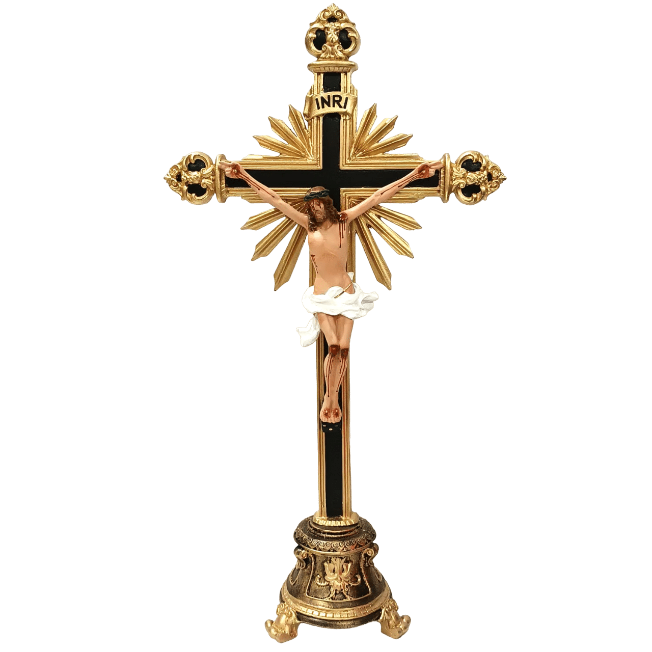 Crucifixo de Mesa Ornado Resina 59 cm. Fabricado em resina com base removível e com acabamento em pintura fina feita artesanalmente com tinta a base de água. Base removível. Imagem para ambiente interno.