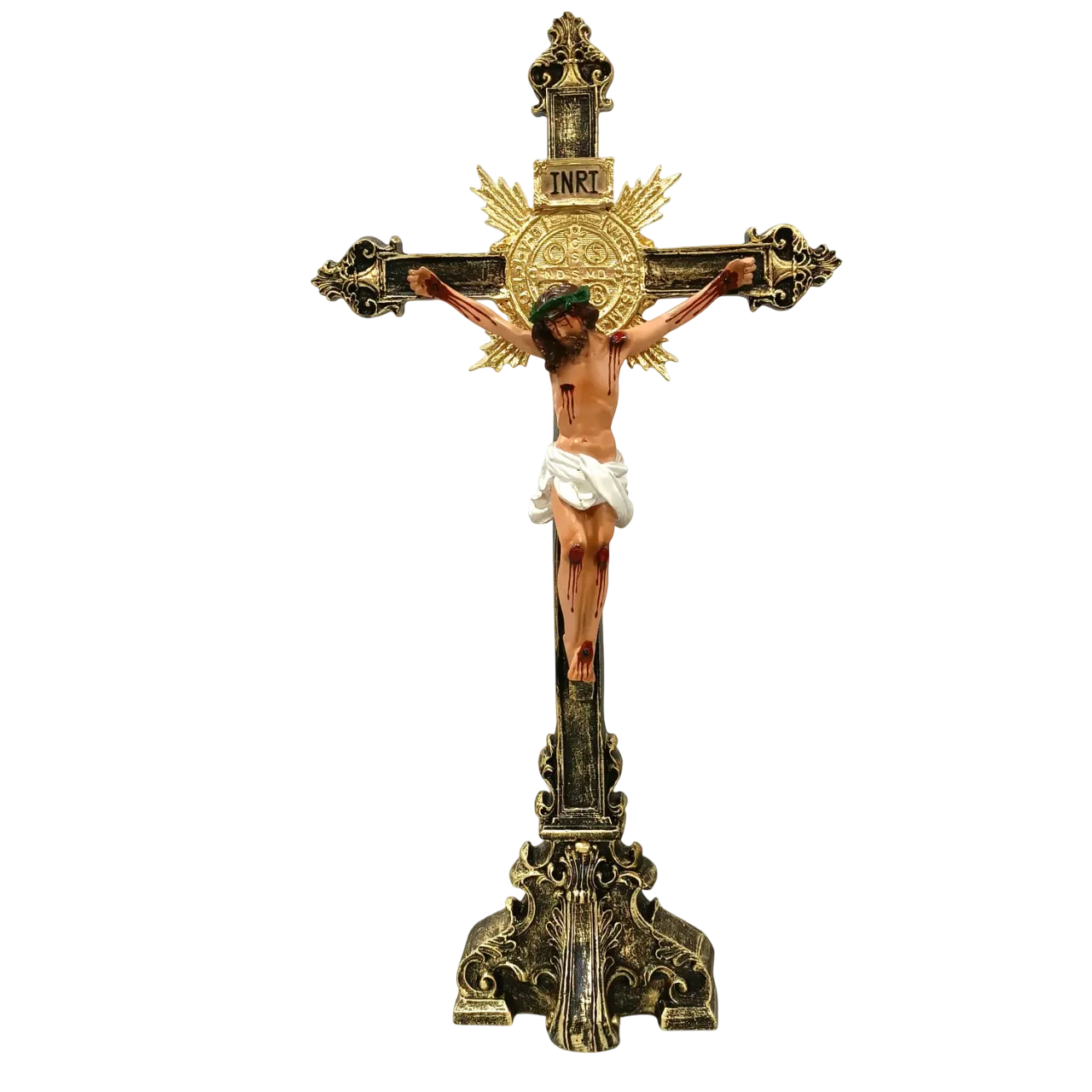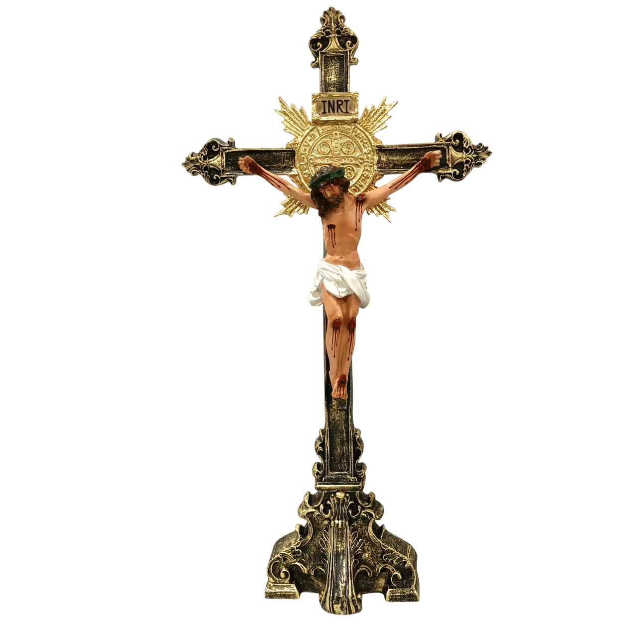 Crucifixo de Mesa São Bento 53 cm. Fabricado em resina com acabamento em pintura fina feita artesanalmente com tinta a base de água. Imagem para ambiente interno.