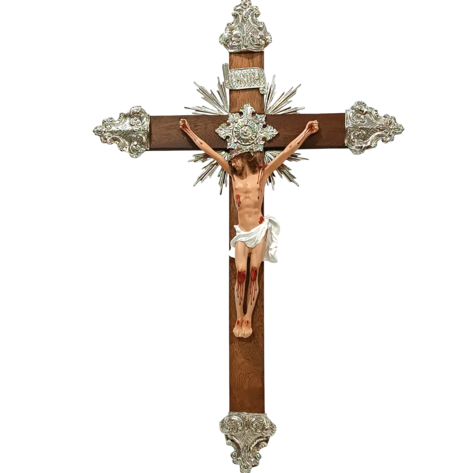 Crucifixo de parece com 65cm, corpo 30cm. Fabricado em resina com acabamento em pintura fina feita artesanalmente com tinta a base de água. Imagem para ambiente interno. A cruz é feita em madeira, com ponteiras e resplendor em latão banhado a níquel. Peça lindissíma