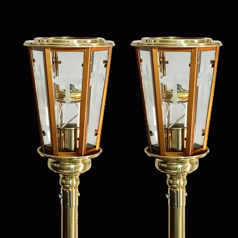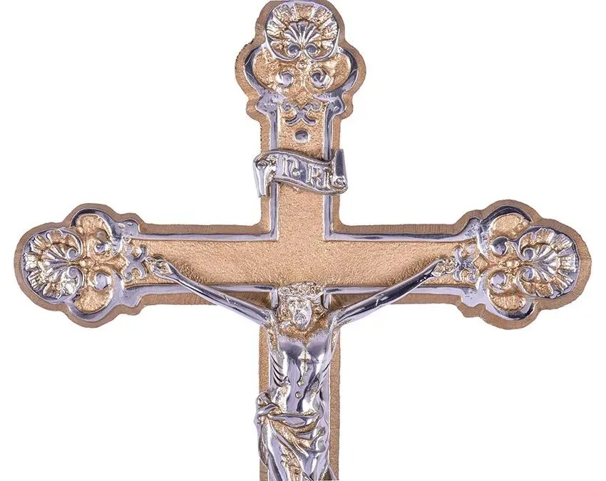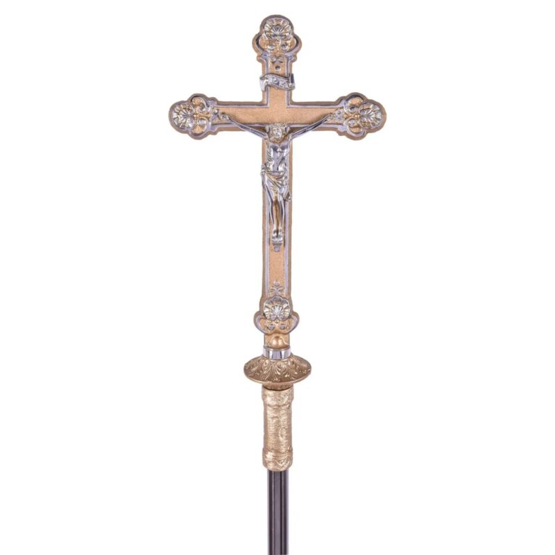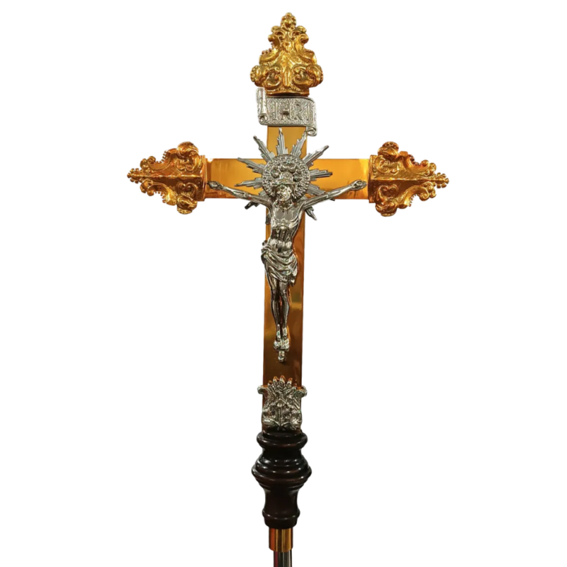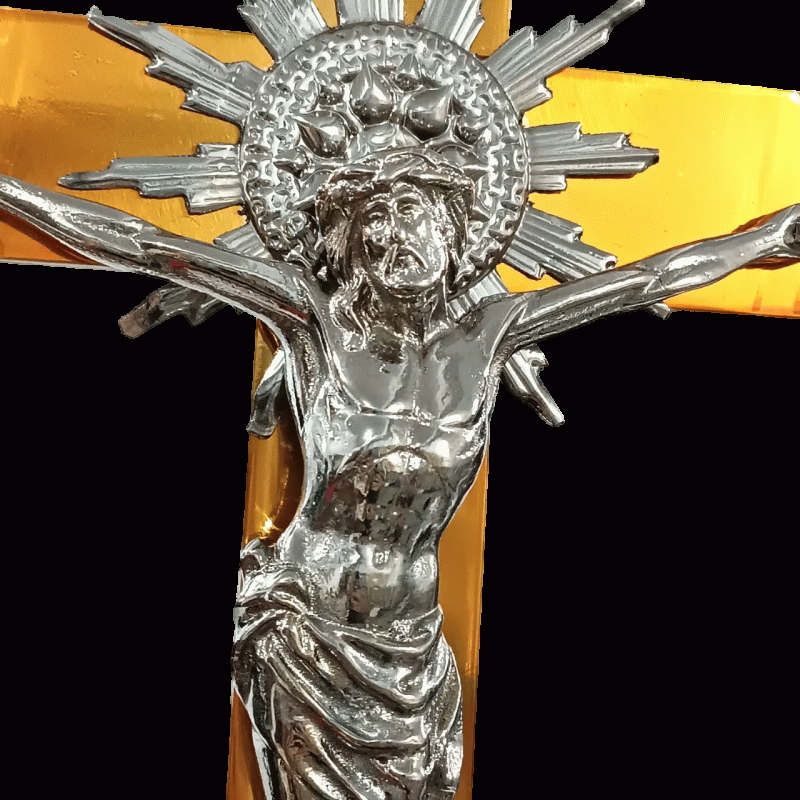 A cruz processional é fabricada em peroba rosa, madeira maciça de ótima qualidade. O acabamento é em verniz, que garante a beleza e a durabilidade da peça. O corpo é fabricado em resina com acabamento em pintura fina feita artesanalmente com tinta acrílica. Produto para ambiente interno.