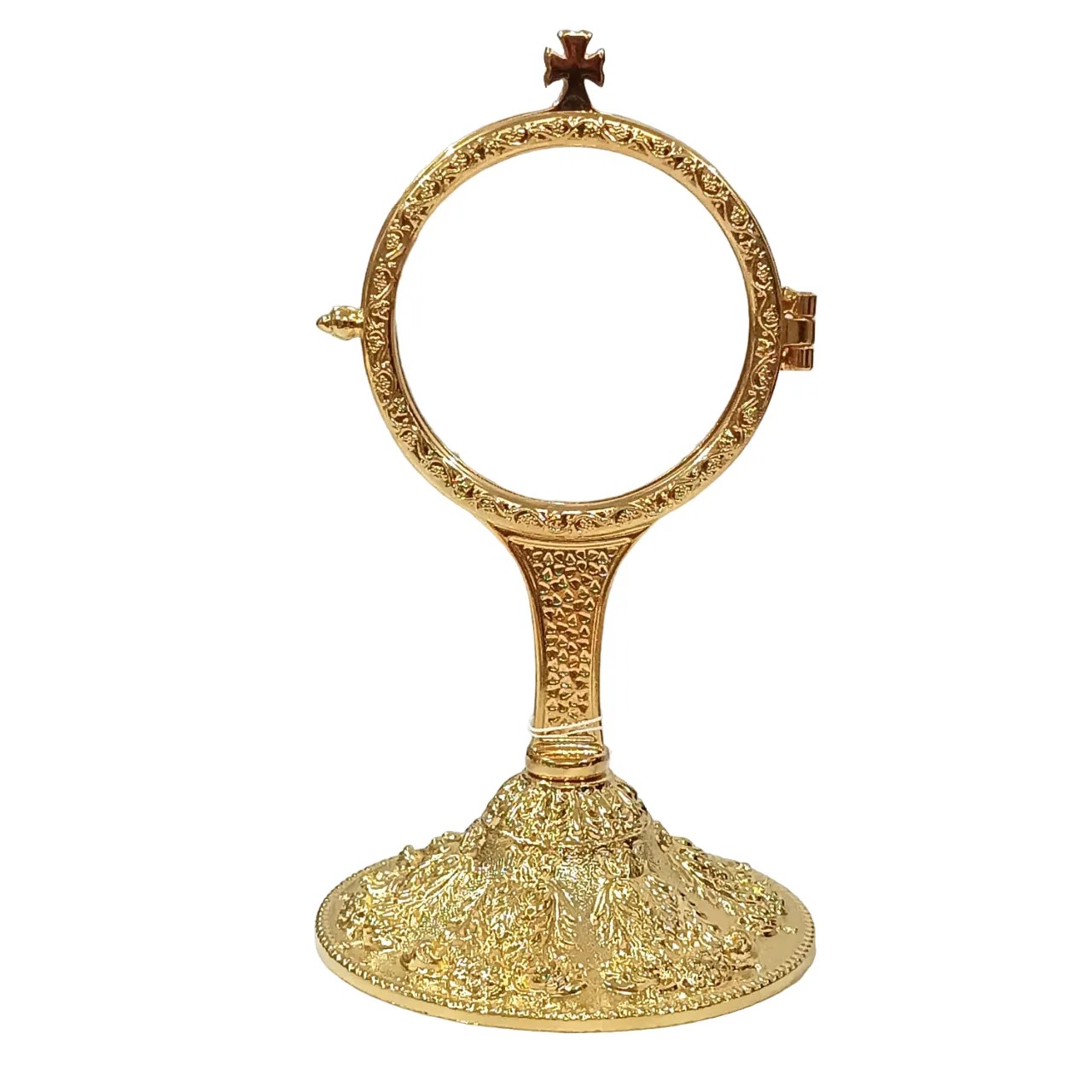 Custódia para hóstia magna em latão fundido e dourada sobre base com decorações elegantes. A base tem acabamento dourado.