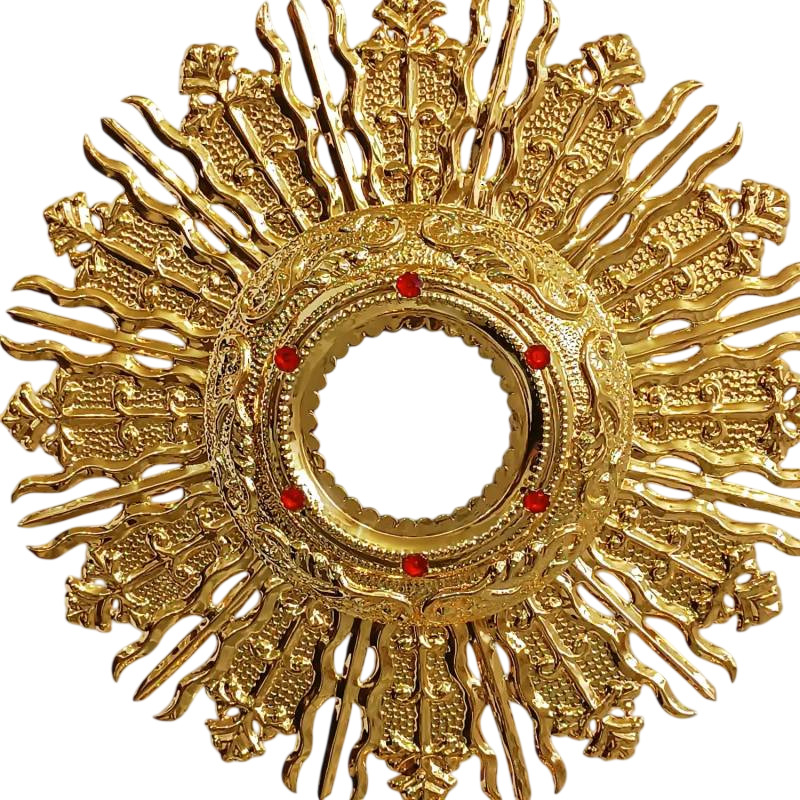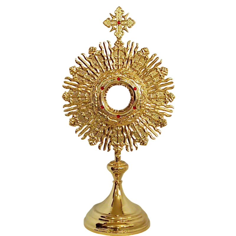 Custódia litúrgica italiana com acabamento em banho de ouro 24 quilates, trazendo brilho e sofisticação à peça. O design incorpora ramos estilizados e pedra decorativa vermelha na base do ostensório, simbolizando vida e fé. Possui abertura frontal para fácil colocação da hóstia e acomoda hóstias de até 7 cm de diâmetro. Com 16 cm de altura e base de 7 cm, oferece estabilidade e elegância para celebrações eucarísticas e momentos de adoração. Ideal para igrejas, capelas e oratórios que buscam um objeto sagrado de alta qualidade.