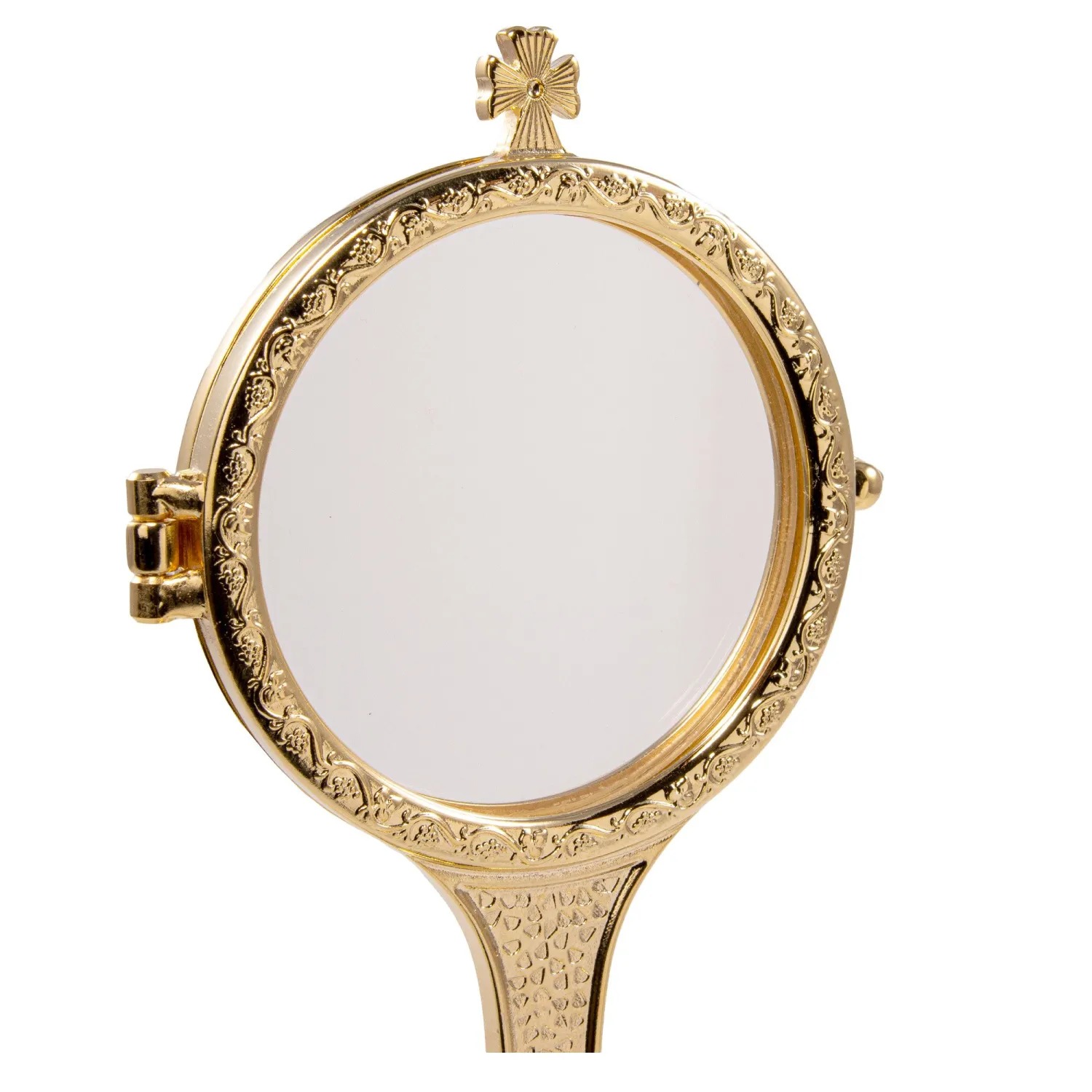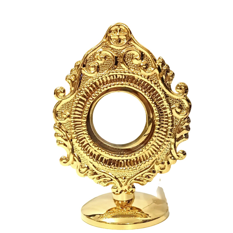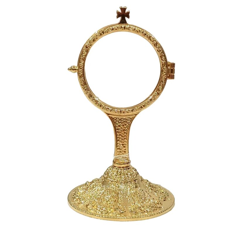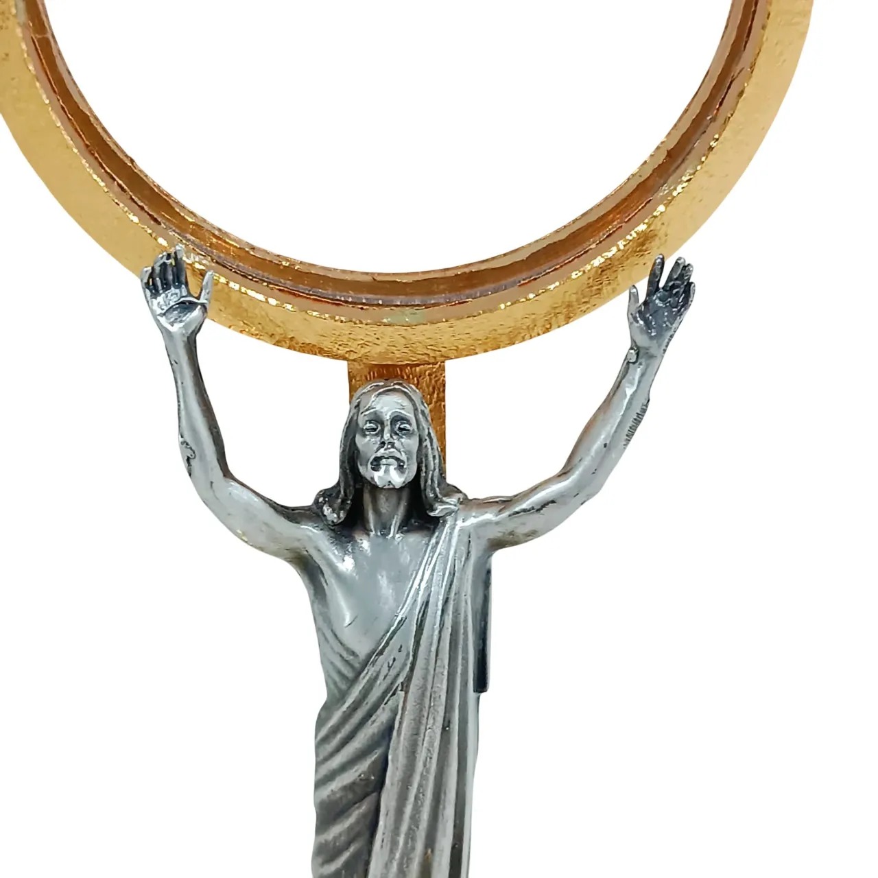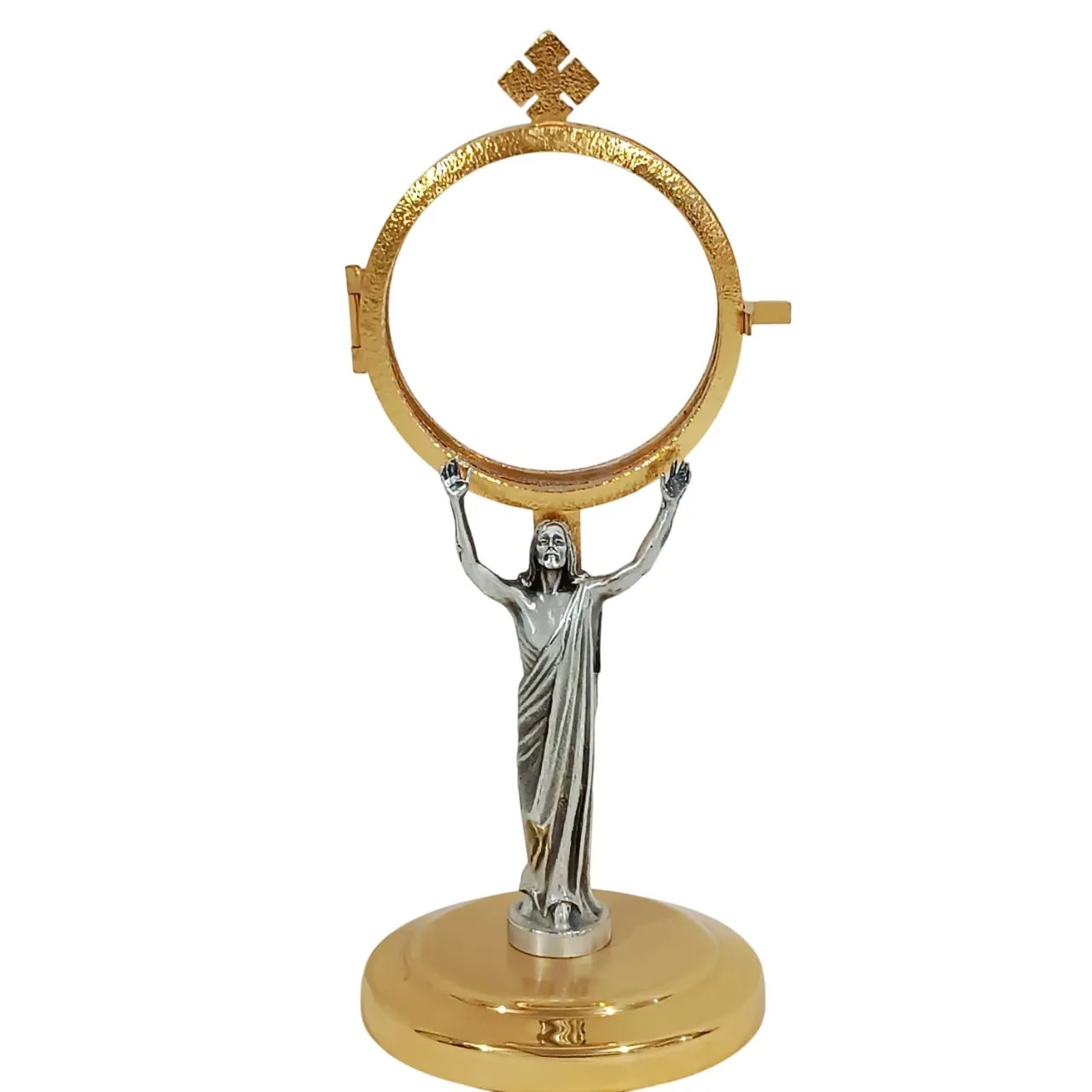 Custódia litúrgica italiana com acabamento em banho de ouro 24 quilates, combinando brilho e nobreza. Possui a imagem detalhada de Cristo Ressuscitado em tom prateado, com os braços erguidos sustentando o ostensório, simbolizando a entrega e a glória da Ressurreição. Acomoda hóstias de até 7 cm de diâmetro e conta com sistema de abertura frontal para fácil colocação. Mede 21 cm de altura e base de 7 cm, proporcionando estabilidade e elegância para celebrações eucarísticas e momentos de adoração ao Santíssimo Sacramento.