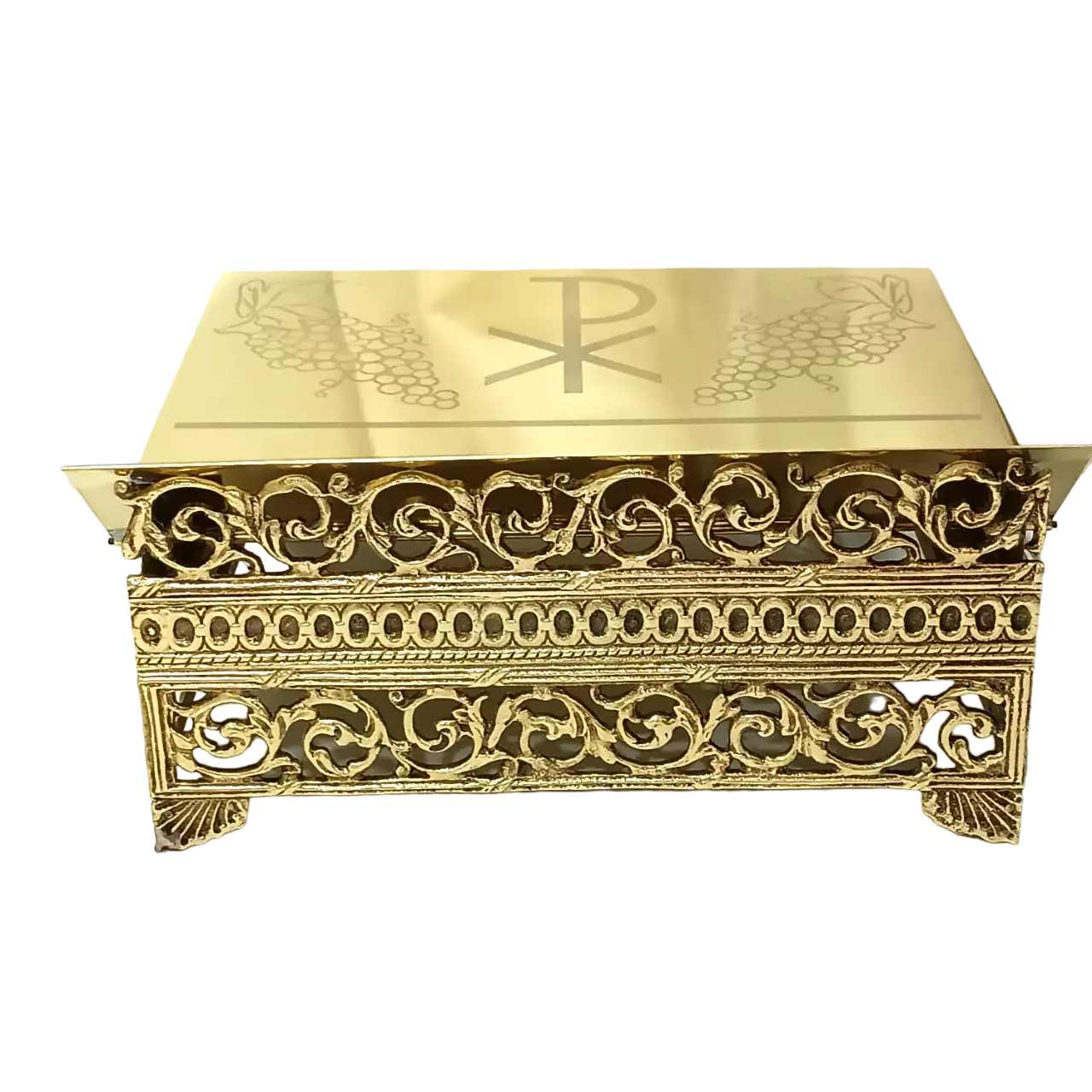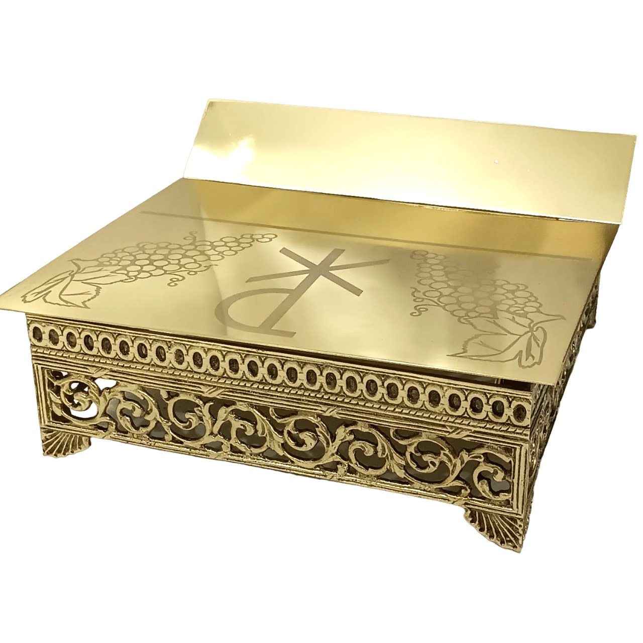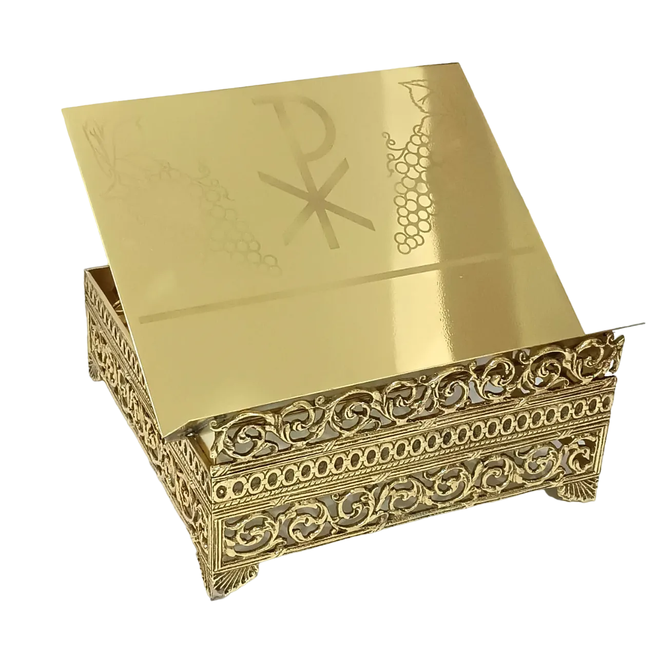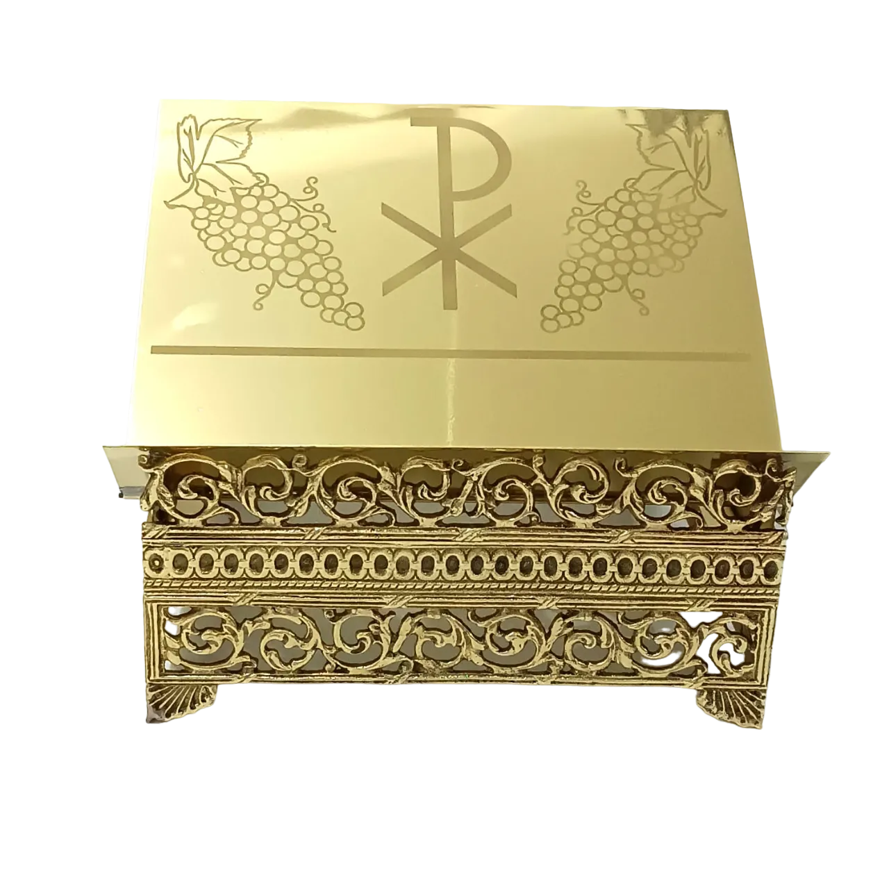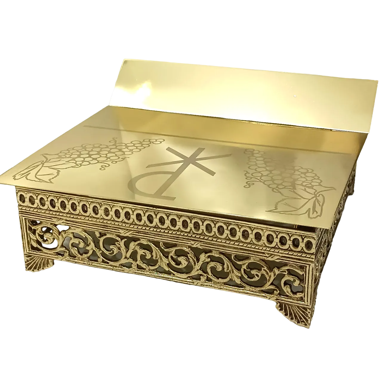 Suporte para missal fabricado em metal com banho e verniz, tendo mais brilho e beleza. Recebe na frente uma gravura em algo relevo, e possui oito opções de altura do suporte do Livro.