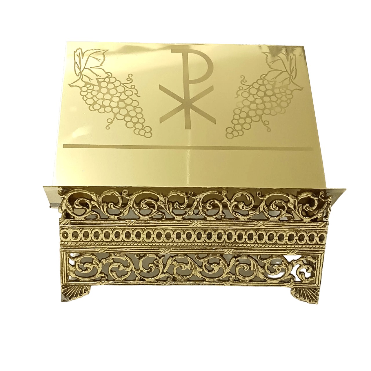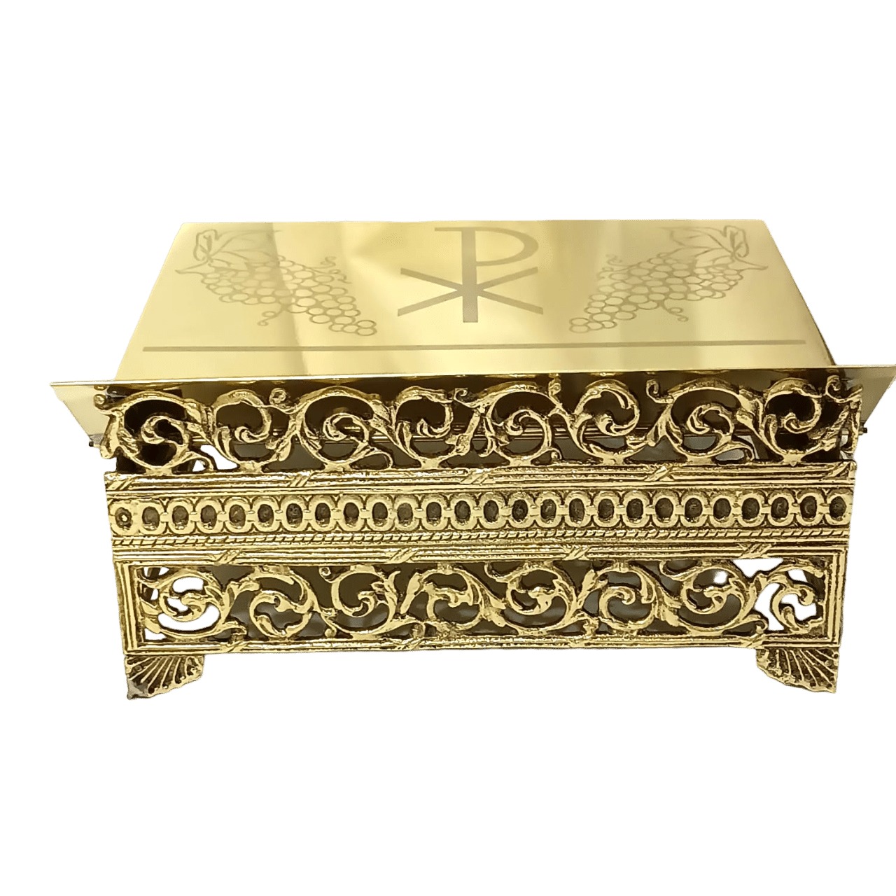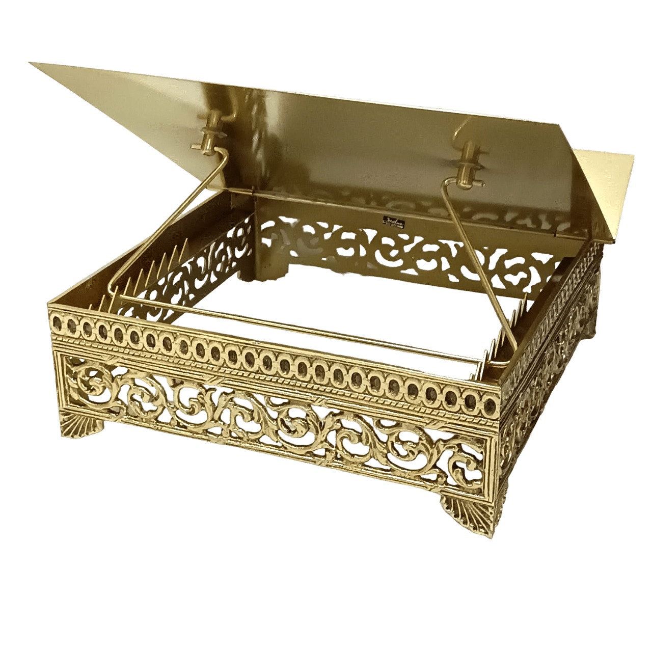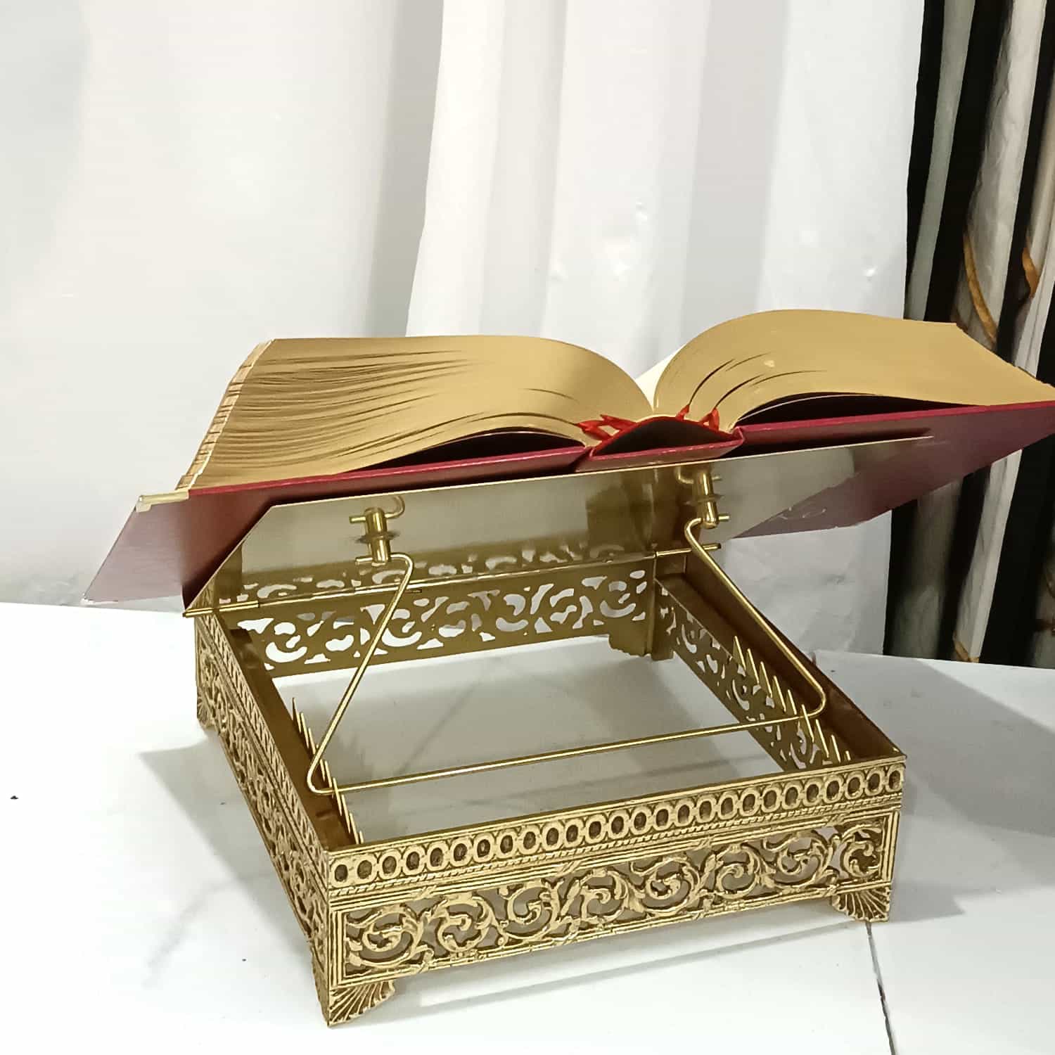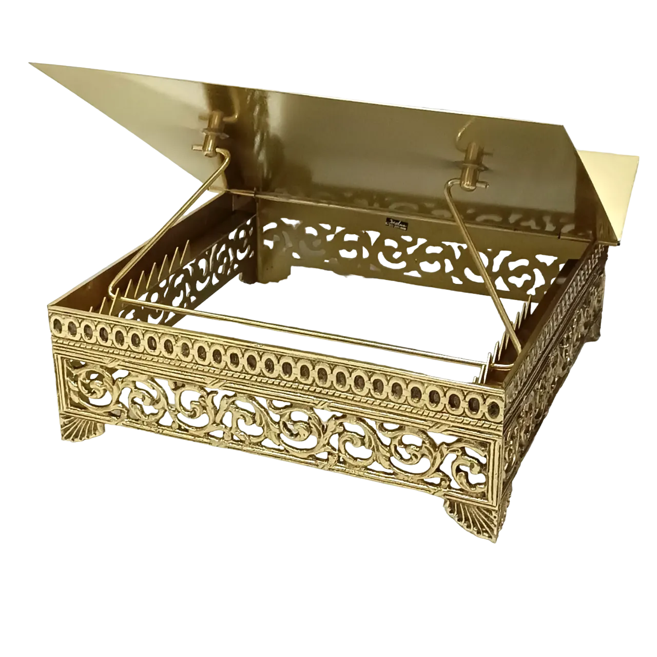 Suporte para missal fabricado em metal com banho e verniz, tendo mais brilho e beleza. Recebe na frente uma gravura em algo relevo, e possui oito opções de altura do suporte do Livro.