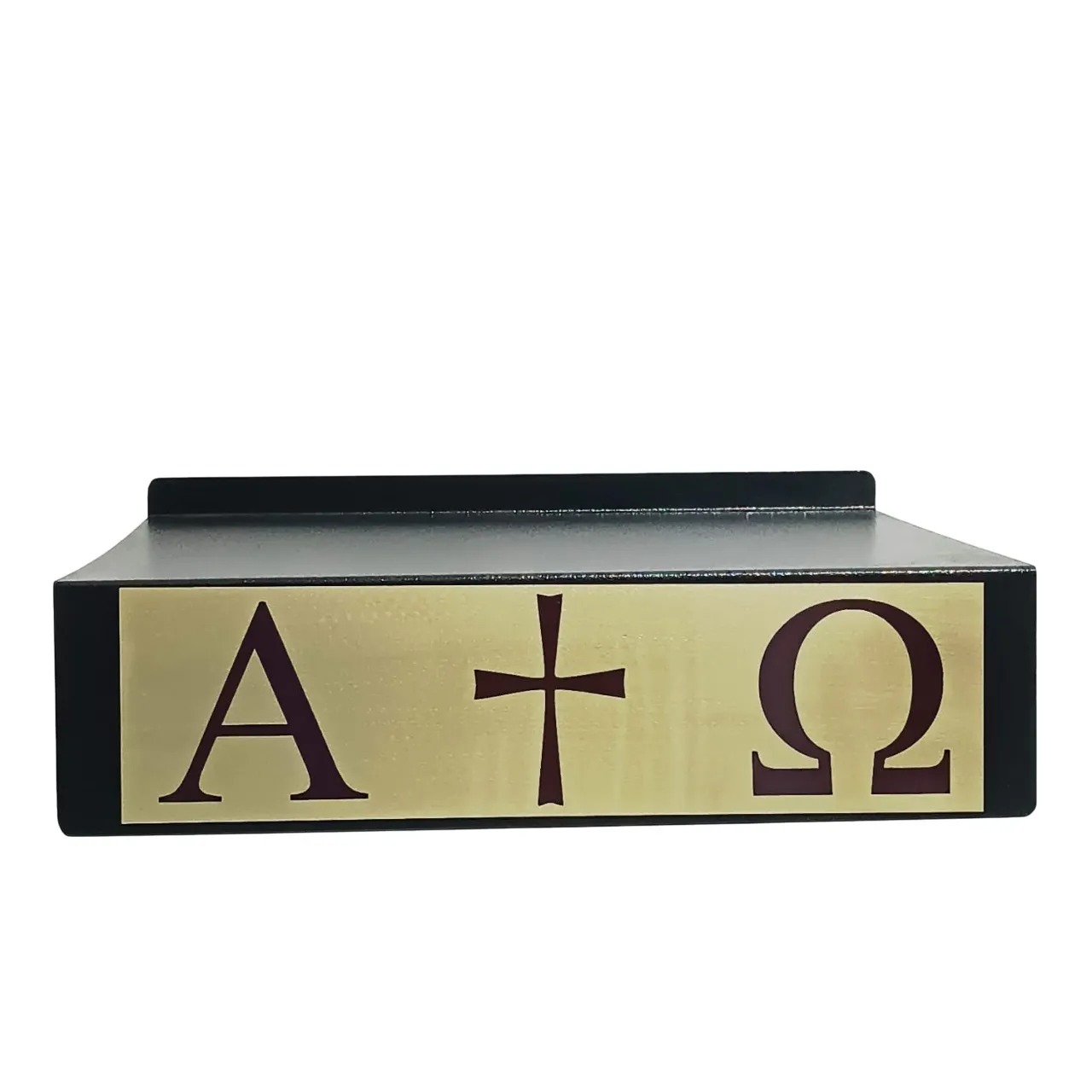 A Estante de Altar Alfa e Ômega com Cruz é uma estante para Altar fabricada em ferro com aplique em metal.